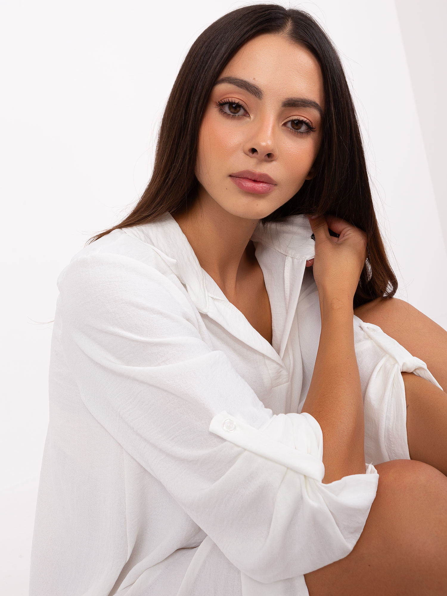Ecru koszulowa sukienka z kołnierzem .