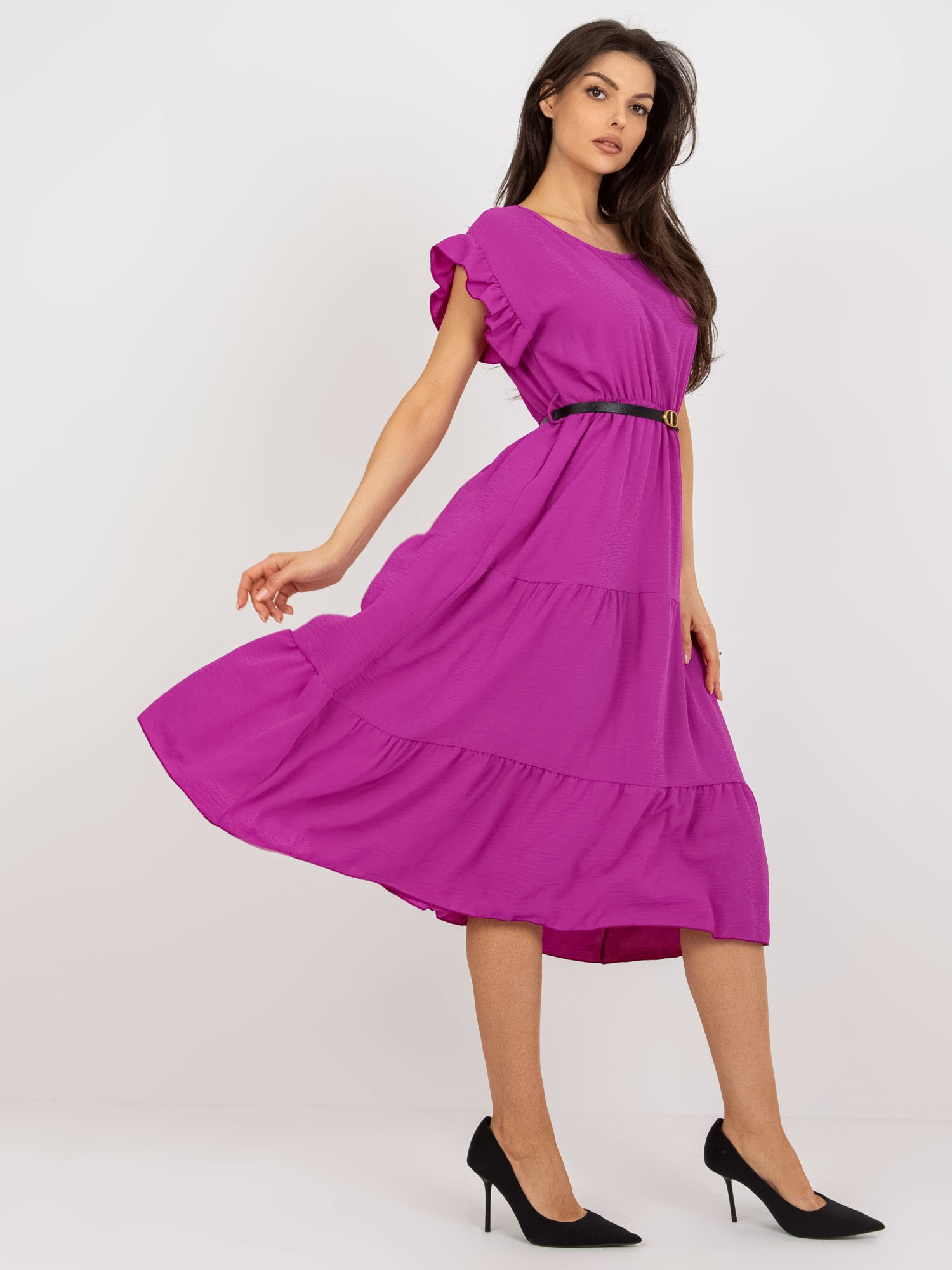 Fioletowa sukienka z falbaną i okrągłym dekoltem .