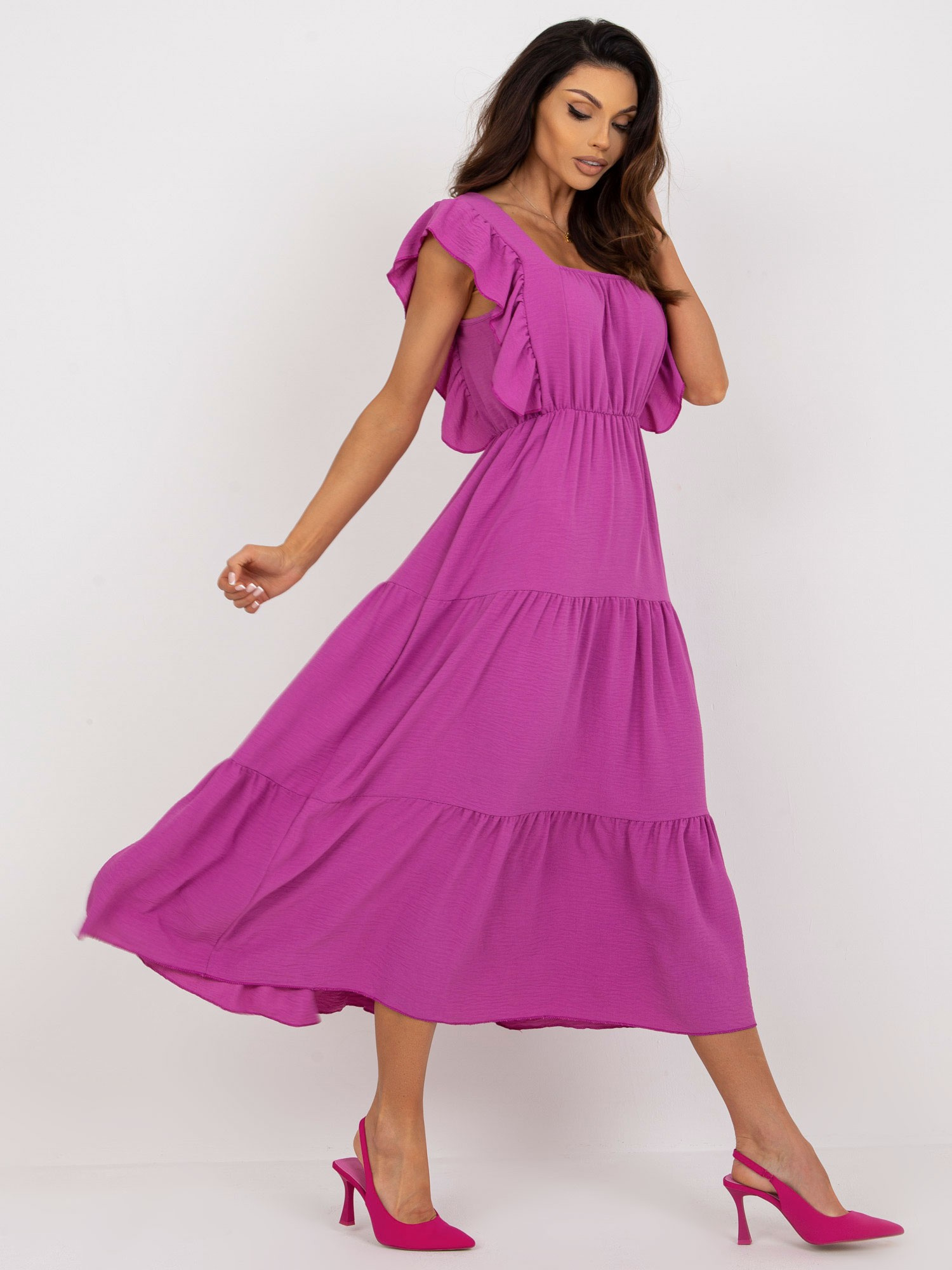 Fioletowa sukienka z falbaną i kwadratowym dekoltem .
