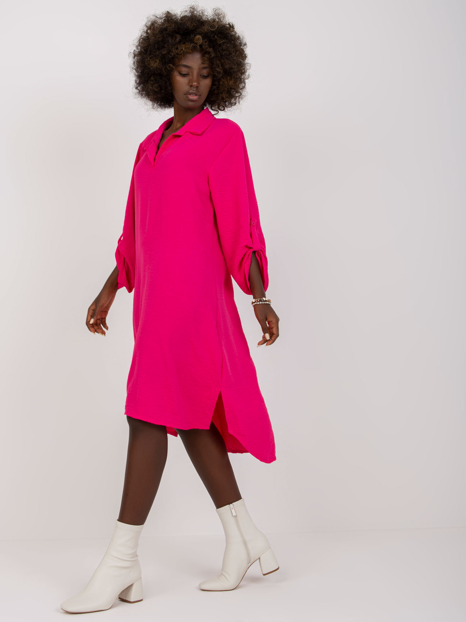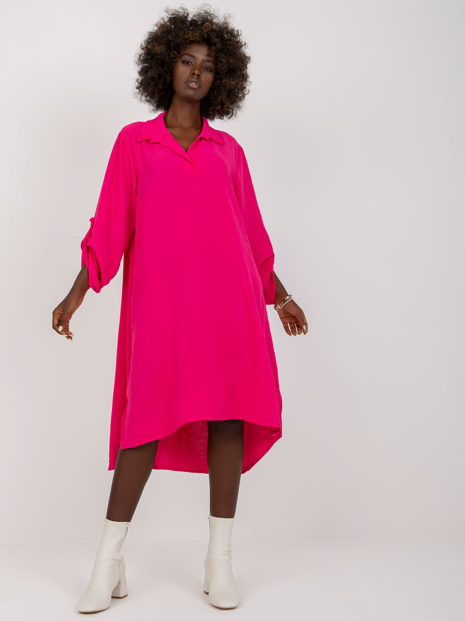 Fuksjowa koszulowa sukienka one size z kołnierzykiem .