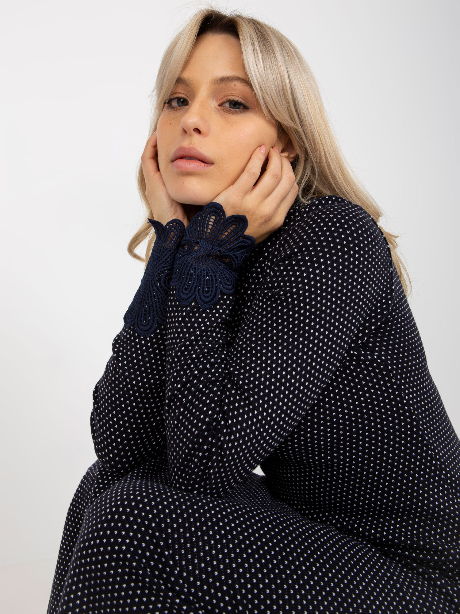 Modelka ma na sobie rozmiar 36. Wymiary modelki: wzrost 170 cm, biust 88 cm, talia 63 cm, biodra 89 cm.