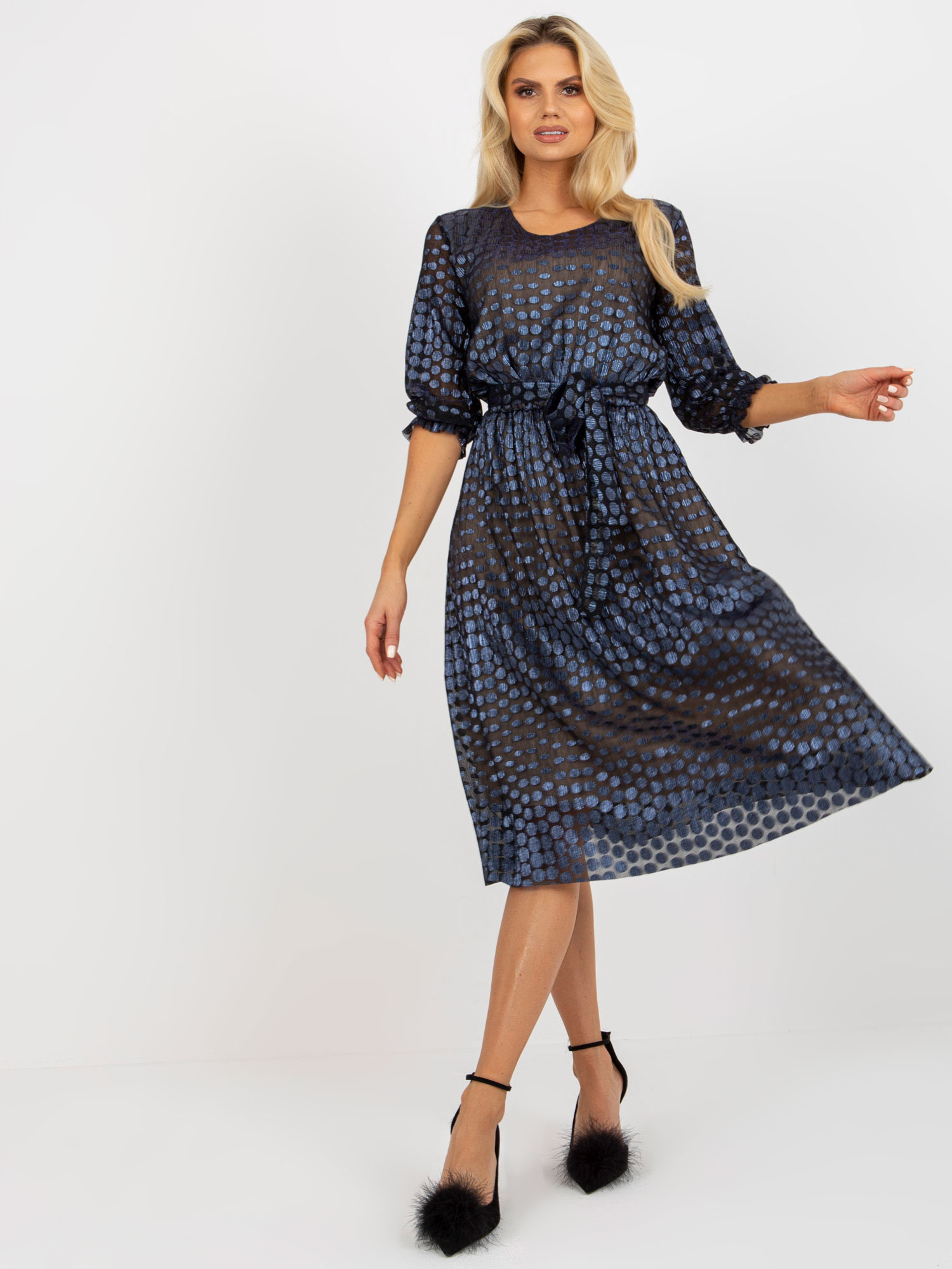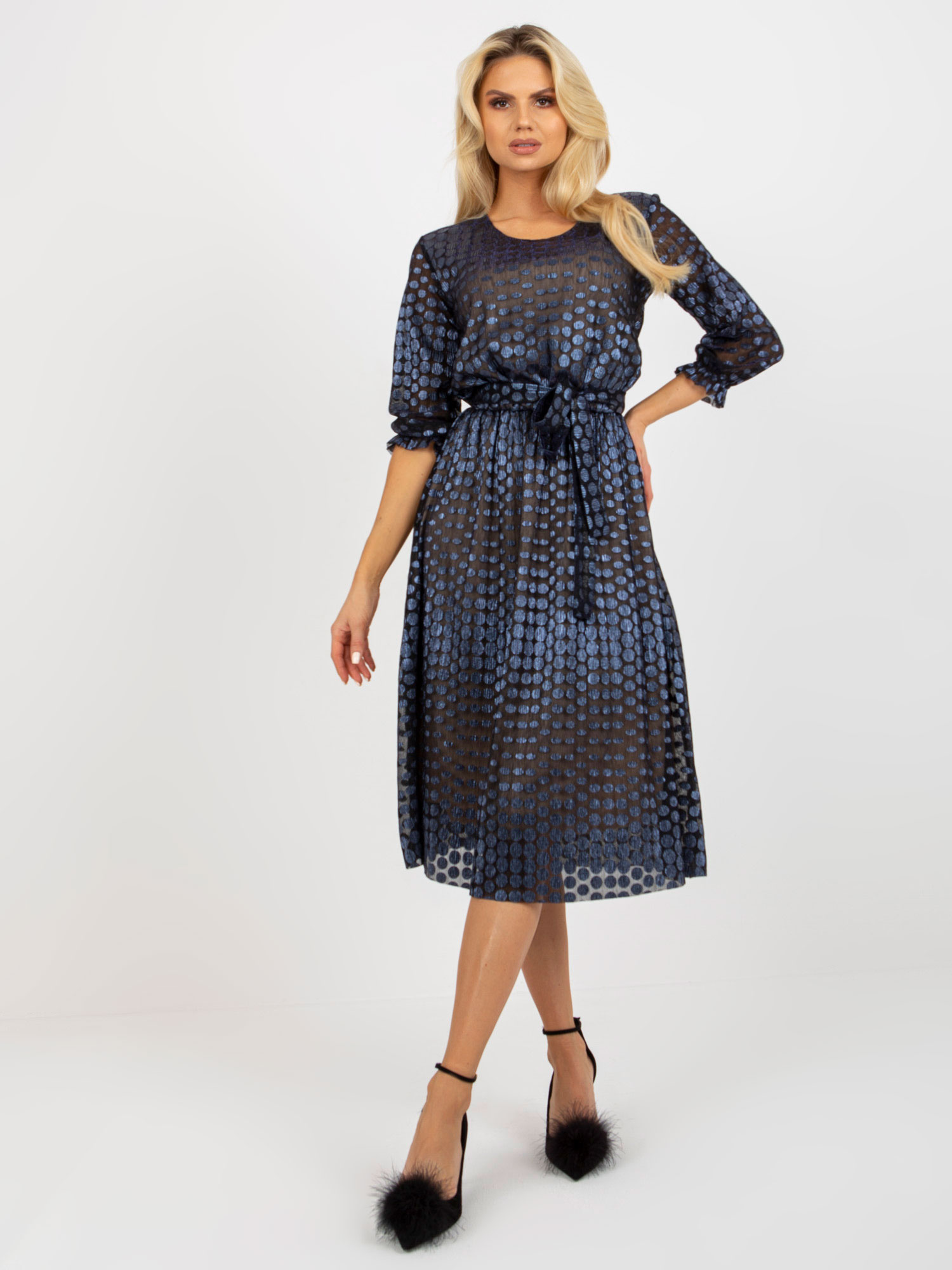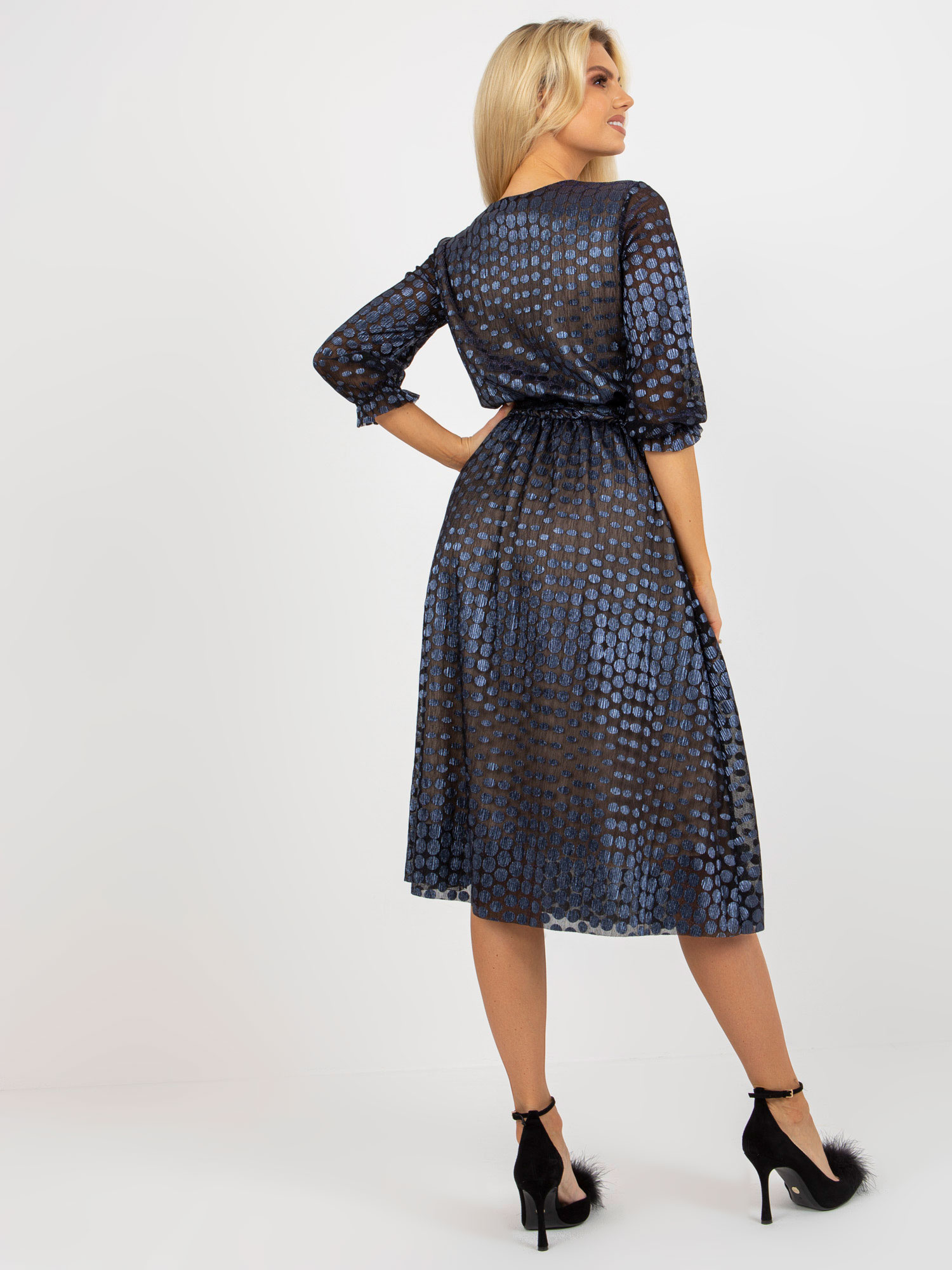 Granatowa midi sukienka wieczorowa w błyszczące kropki .