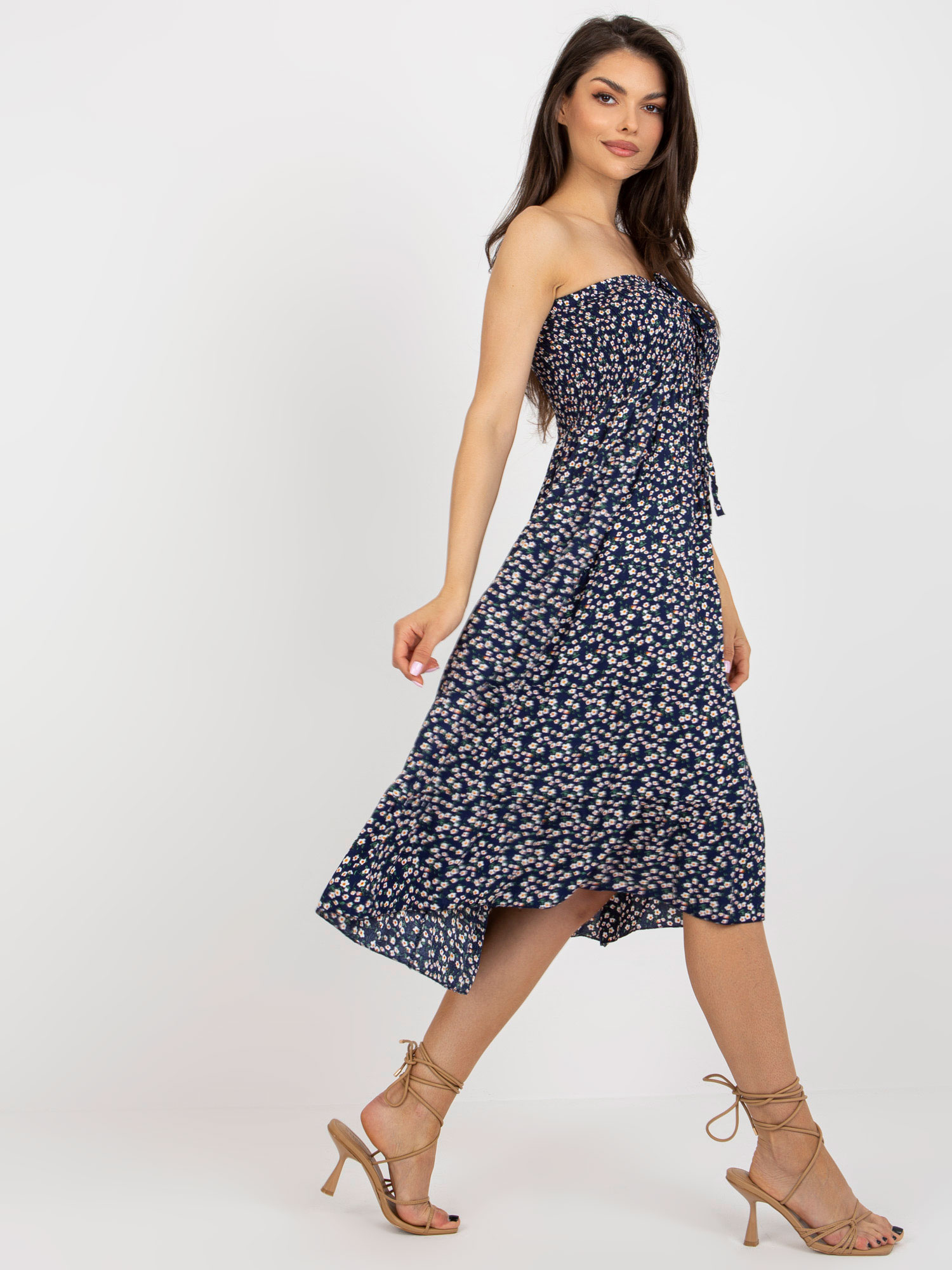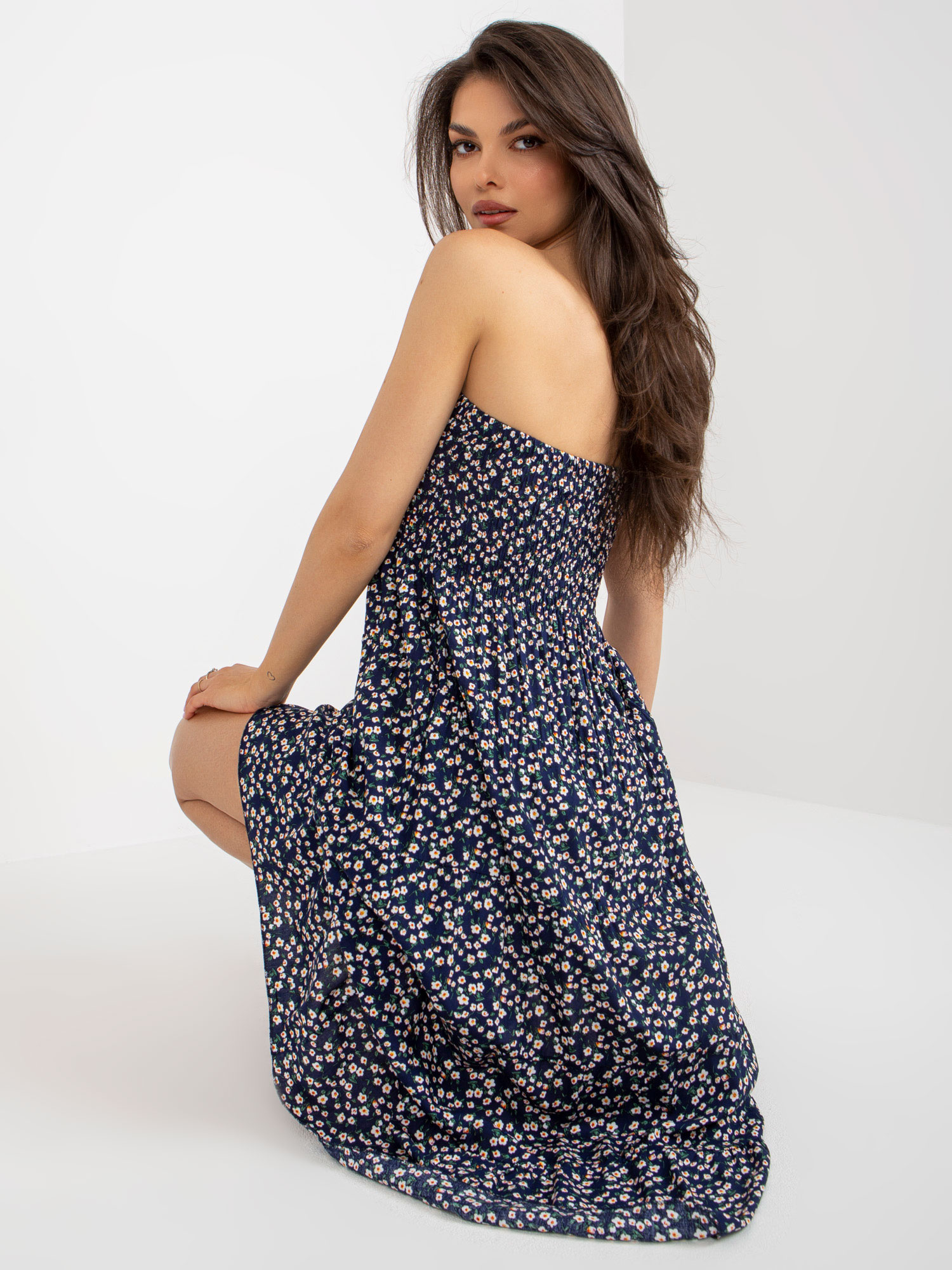 Granatowa midi sukienka w kwiaty bez ramiączek .