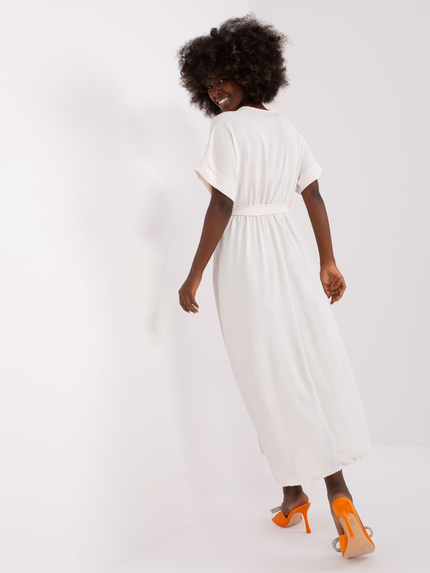 Jasnobeżowa midi sukienka z wiązanym paskiem .