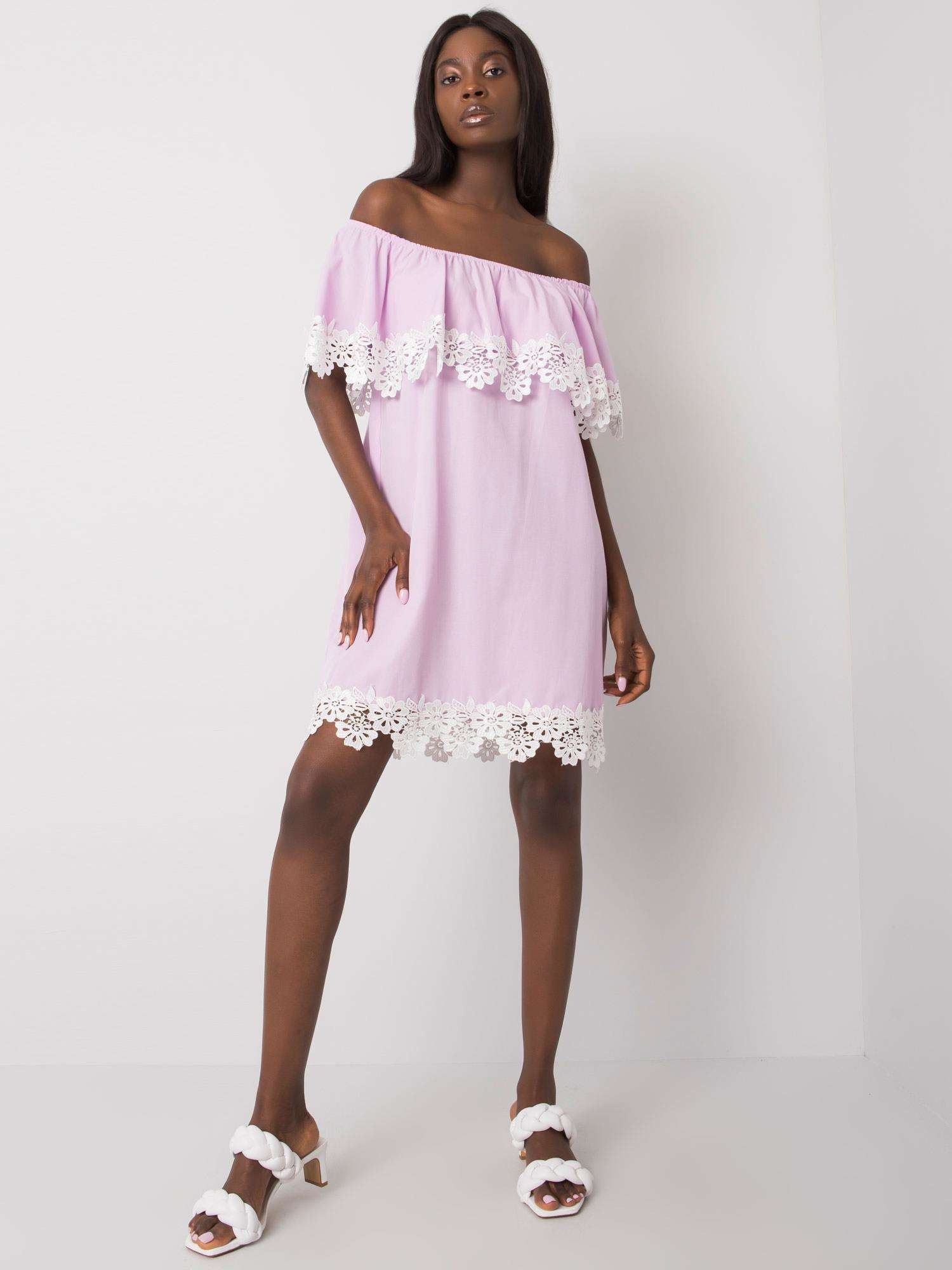 Jasnofioletowa sukienka z hiszpańskim dekoltem.