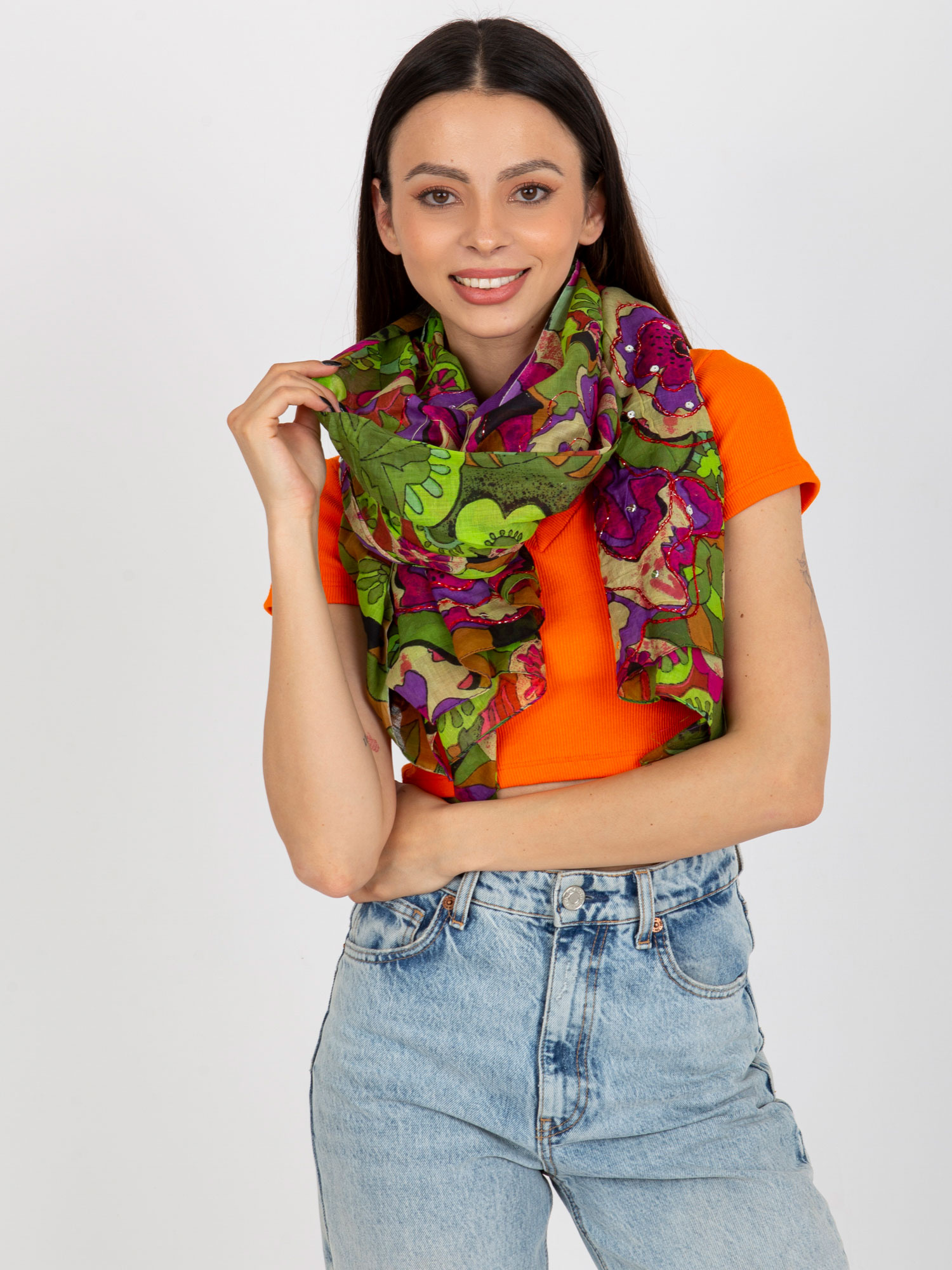 Modelka ma na sobie rozmiar one size. Wymiary modelki: wzrost 172 cm, biust 88 cm, talia 63 cm, biodra 92 cm.