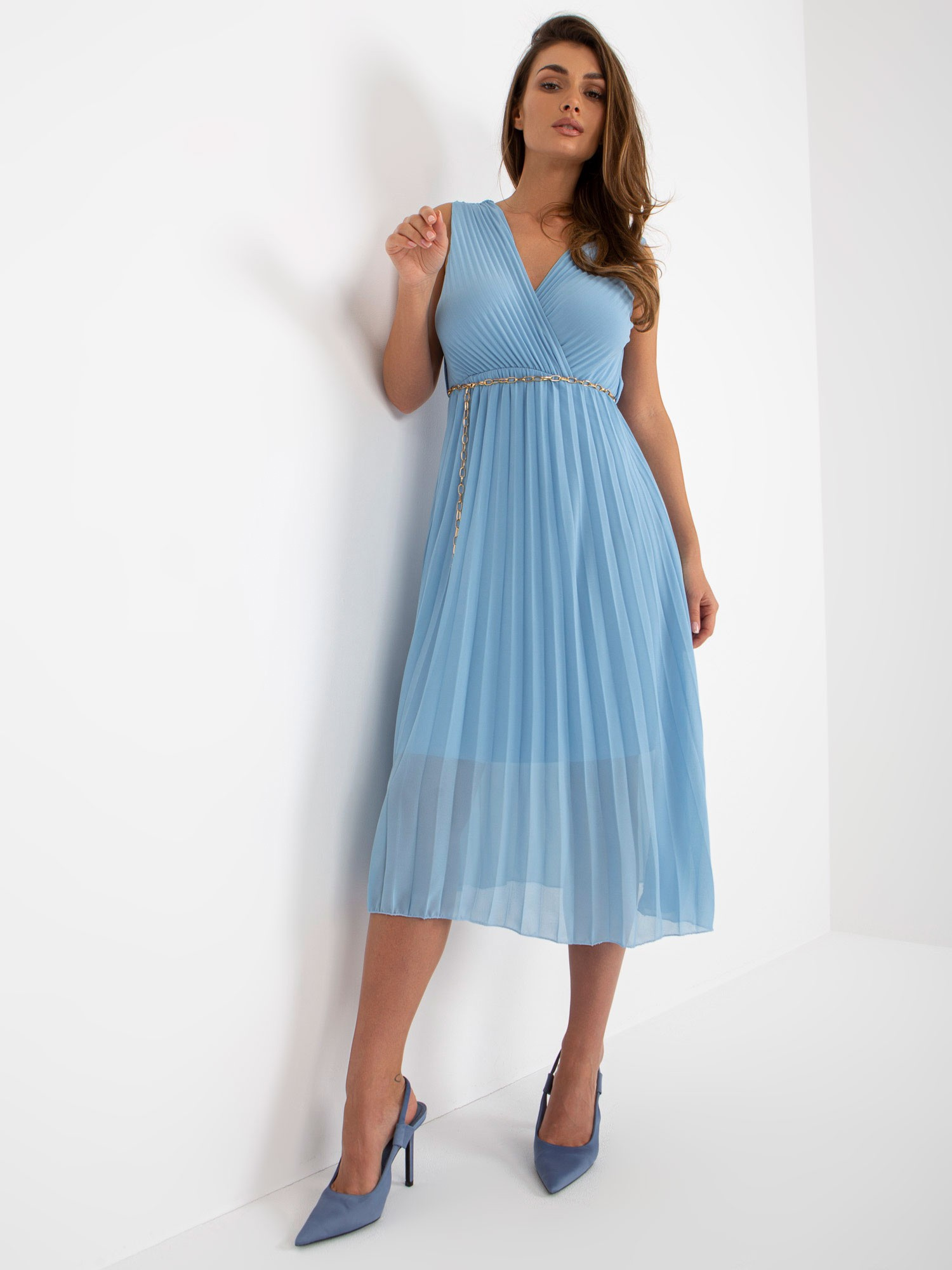 Jasnoniebieska plisowana sukienka bez rękawów .