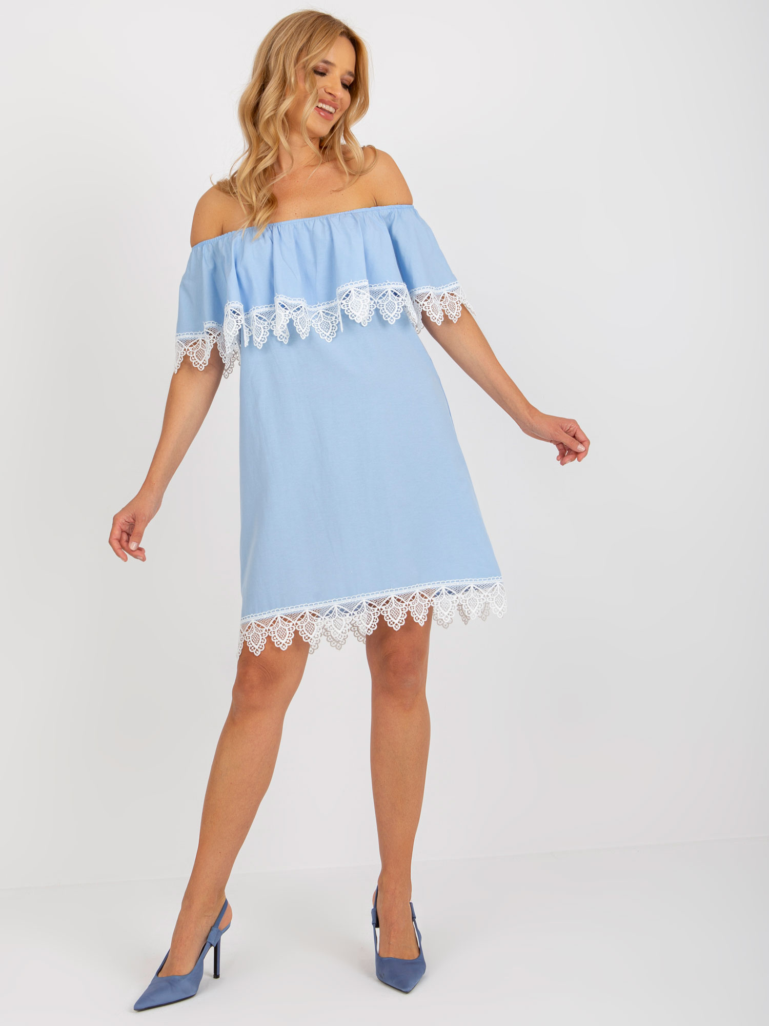 Jasnoniebieska damska sukienka hiszpanka z falbaną .