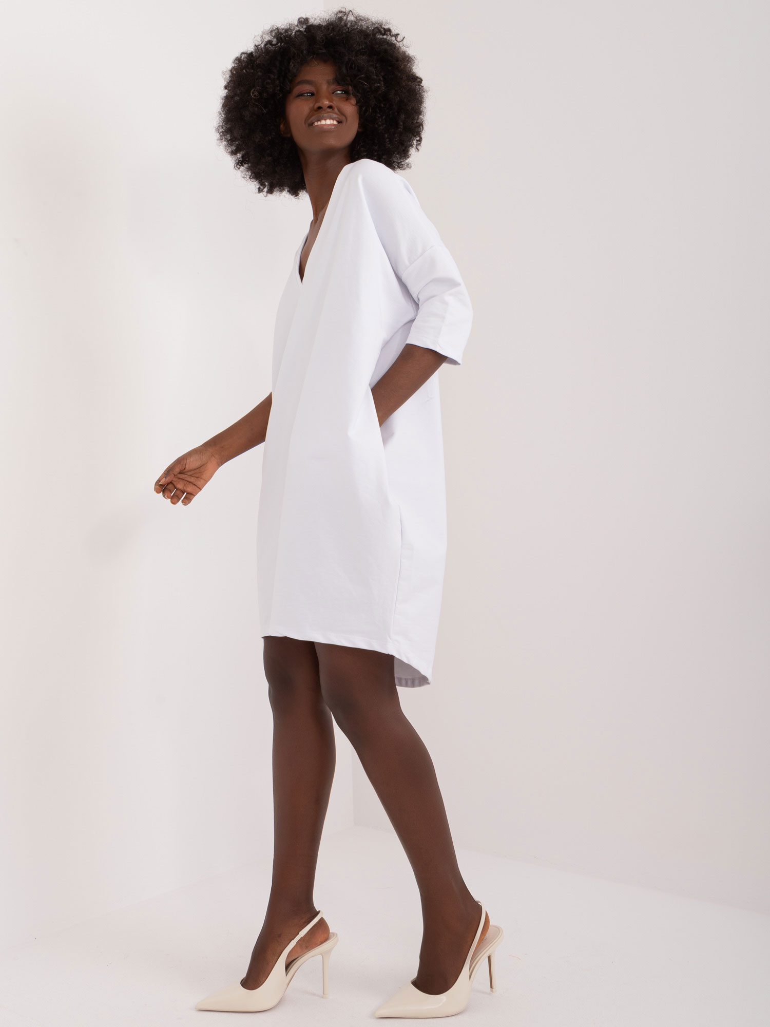 Wymiary sukienki w rozmiarze S/M mierzone na płasko: szerokość pod pachami – 46 cm, długość całkowita – 86 cm, długość rękawa – 43 cm