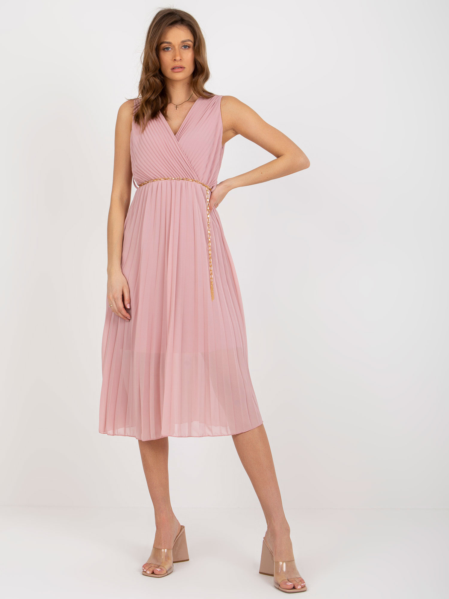 Jasnoróżowa midi sukienka z łańcuszkowym paskiem .