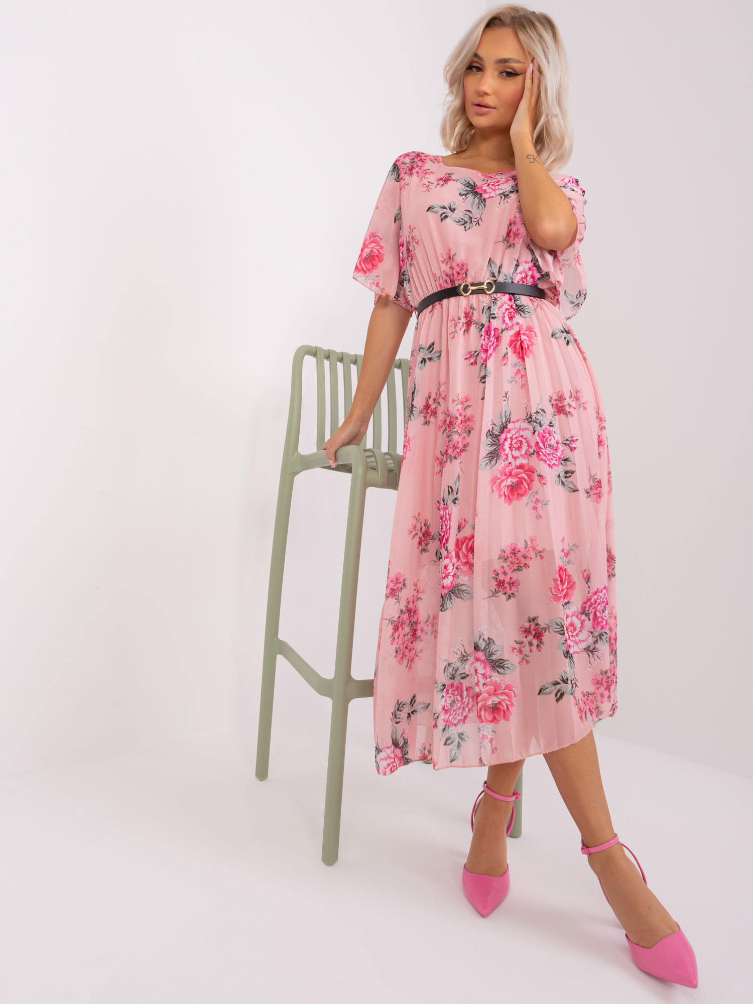 Jasnoróżowa midi sukienka w kwiaty .