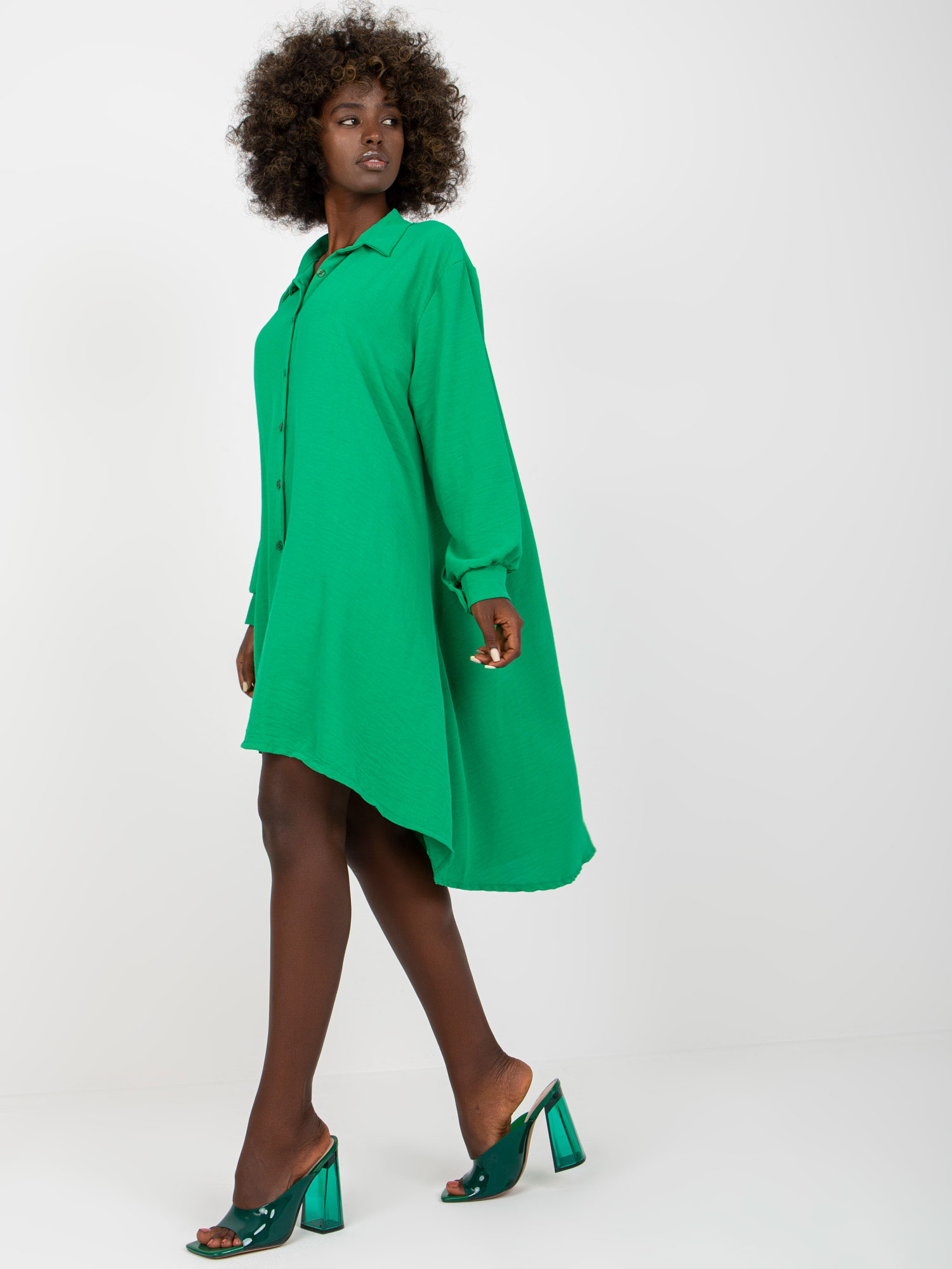 Jasnozielona asymetryczna sukienka szmizjerka z kołnierzykiem .