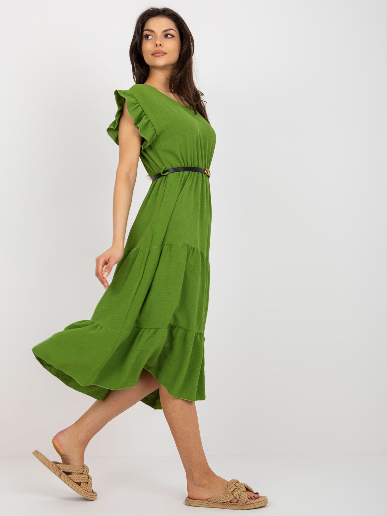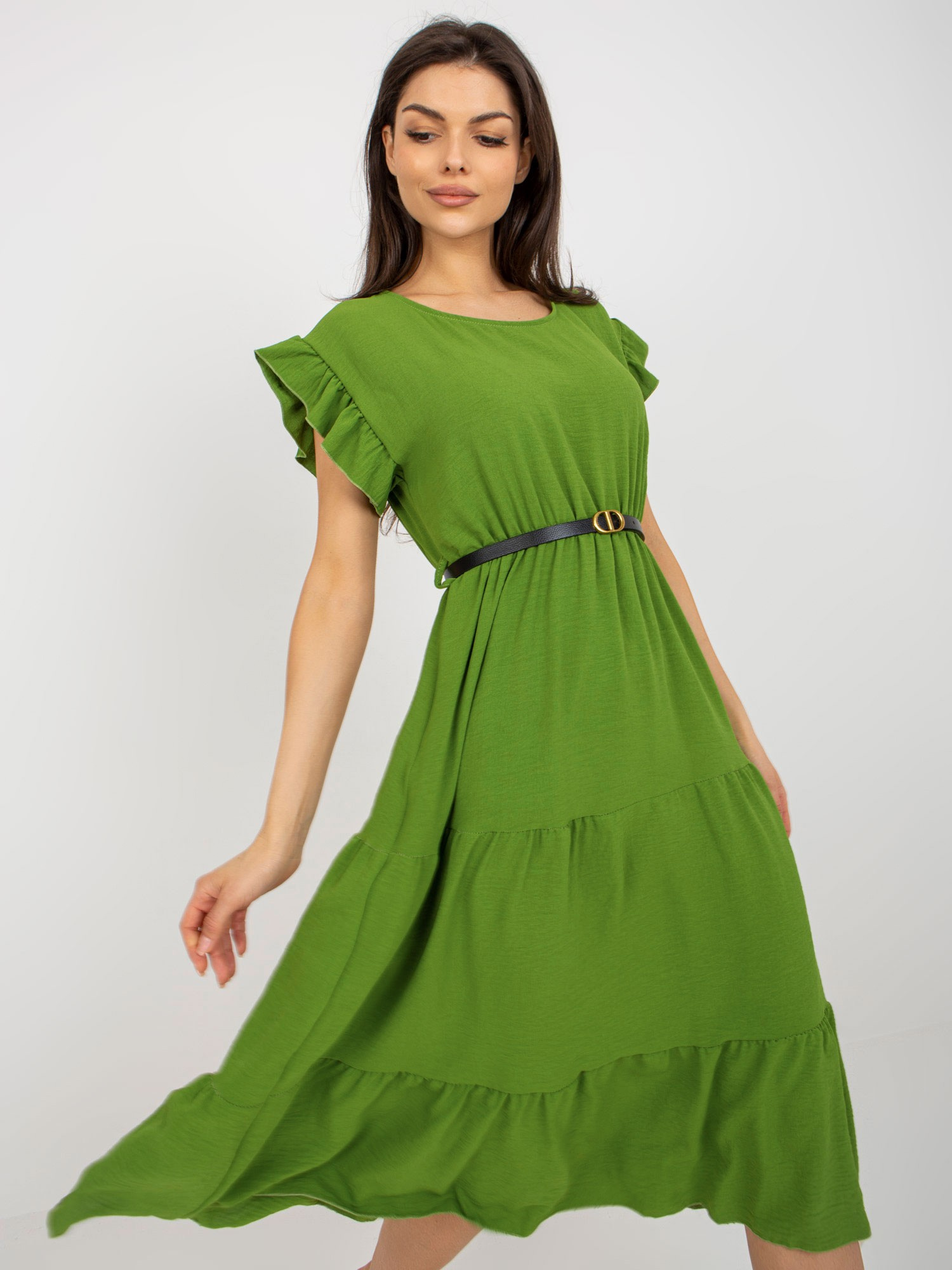 Jasnozielona sukienka z falbaną i krótkim rękawem .