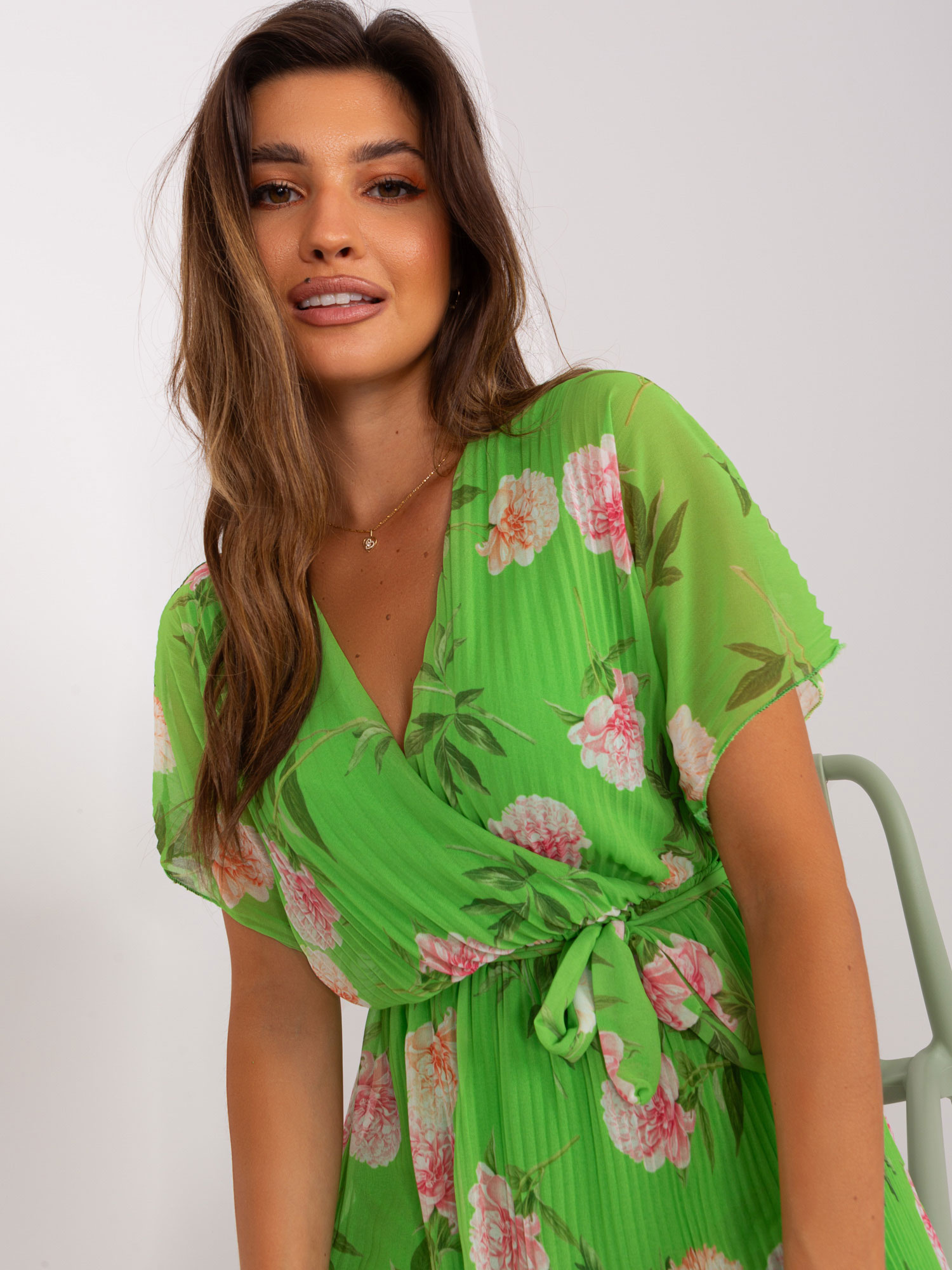 Jasnozielona rozkloszowana sukienka w kwiaty .