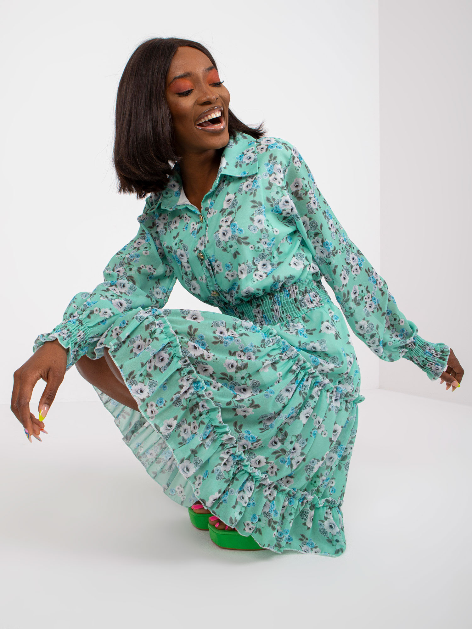 Wymiary sukienki w rozmiarze one size mierzone na płasko: szerokość pod pachami – 50 cm, długość całkowita – 89 cm, długość rękawa – 64 cm