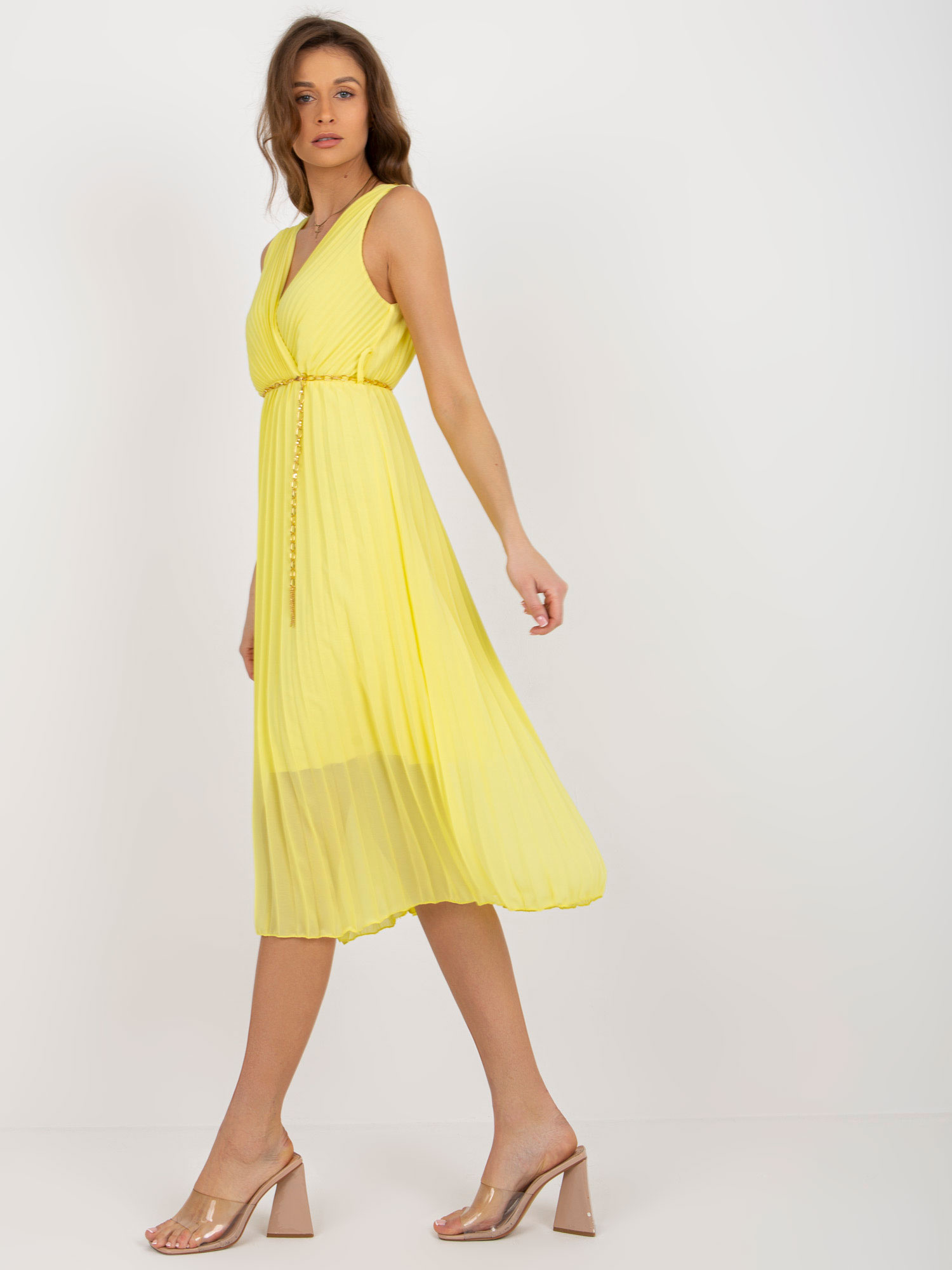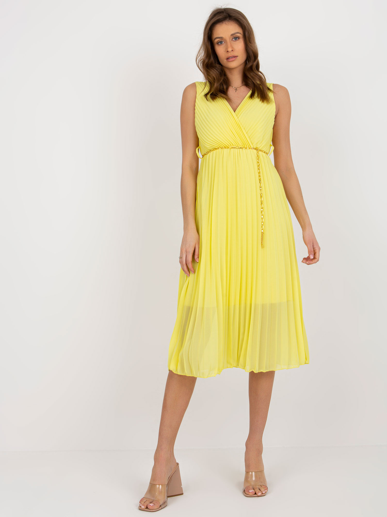 Jasnożółta midi sukienka plisowana z łańcuszkiem .