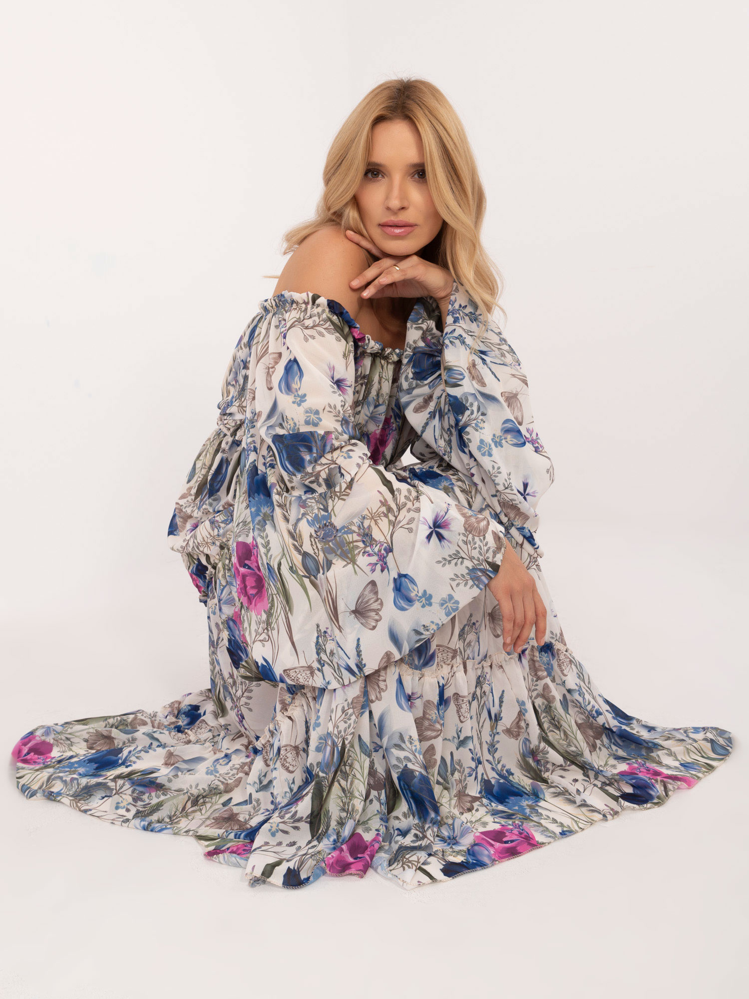 Wymiary sukienki w rozmiarze one size mierzone na płasko: szerokość pod pachami – 45 cm, długość rękawa – 61 cm, długość całkowita – 122 cm.