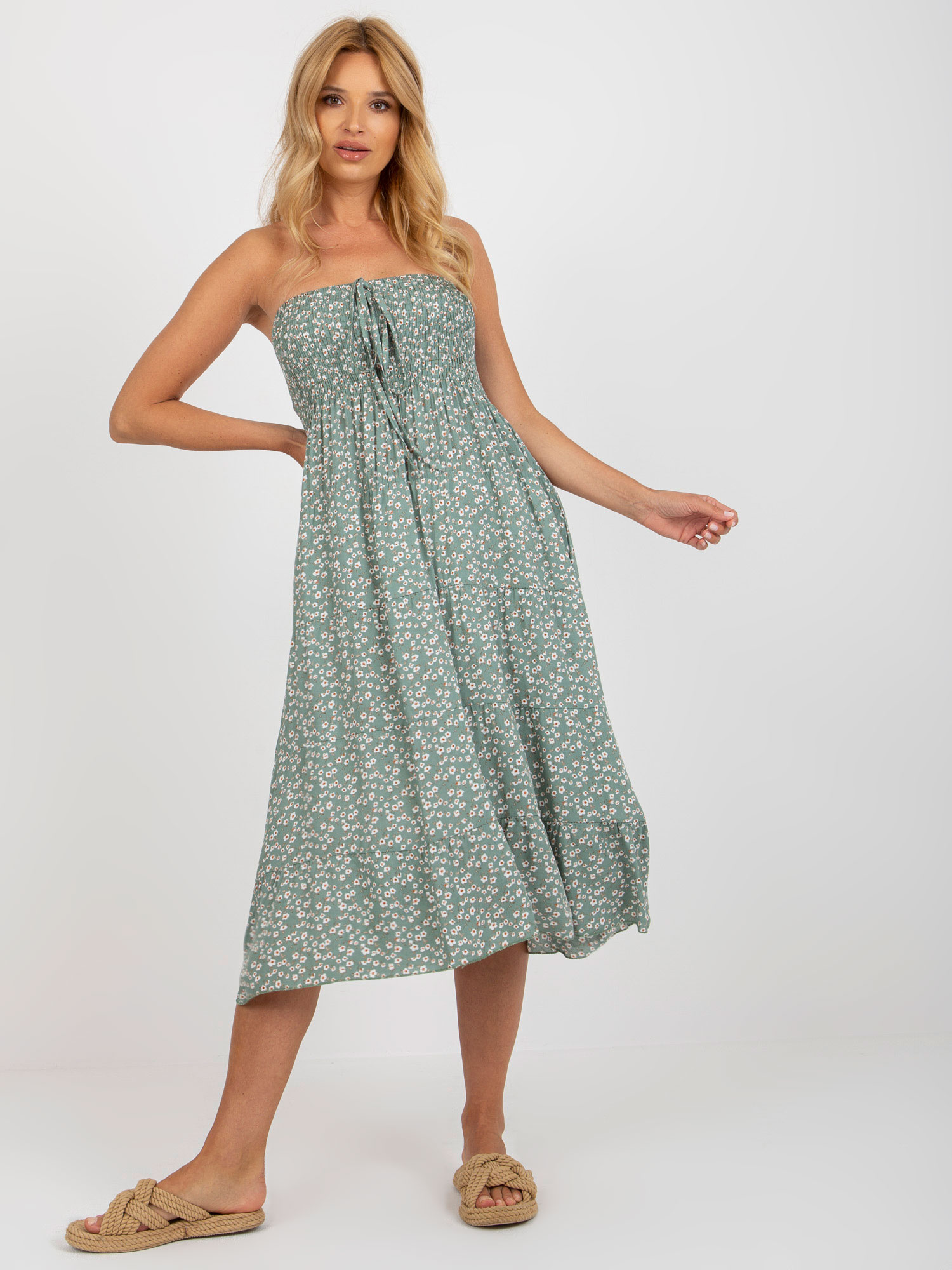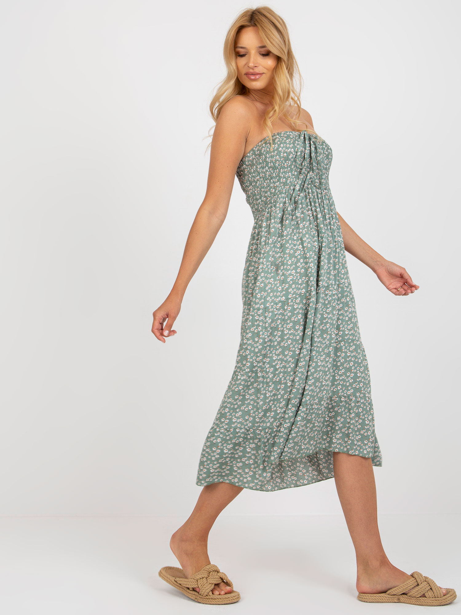 Pistacjowa midi sukienka bandeau z printem .