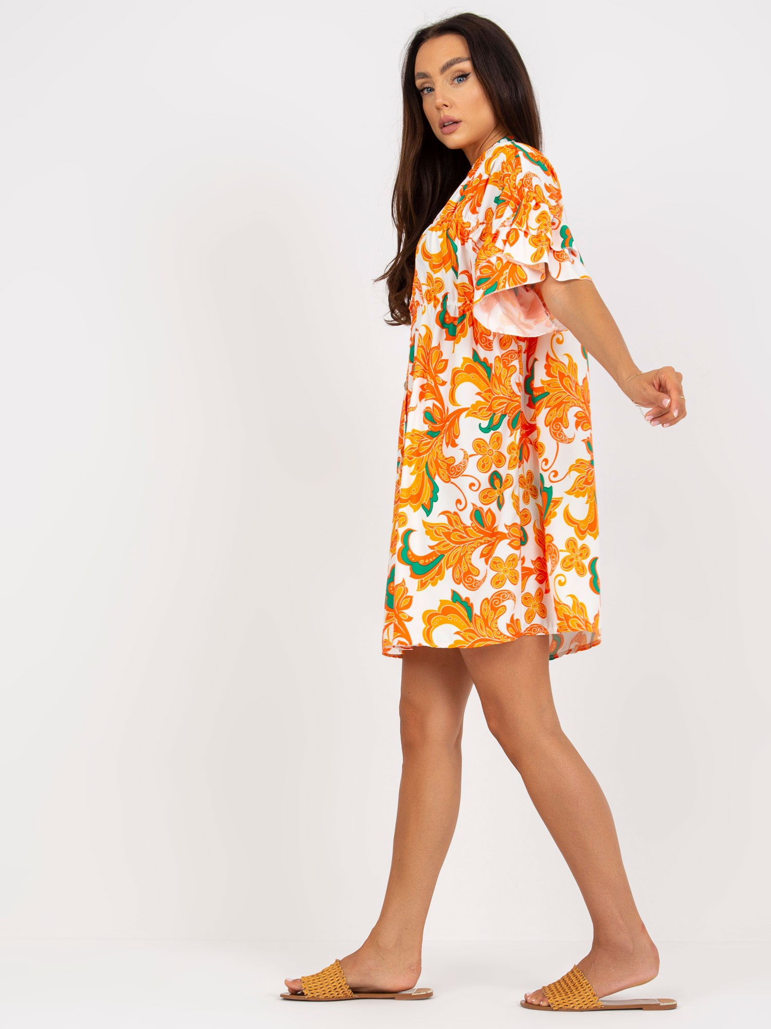 Biało-pomarańczowa sukienka z printami i ozdobnymi guzikami .