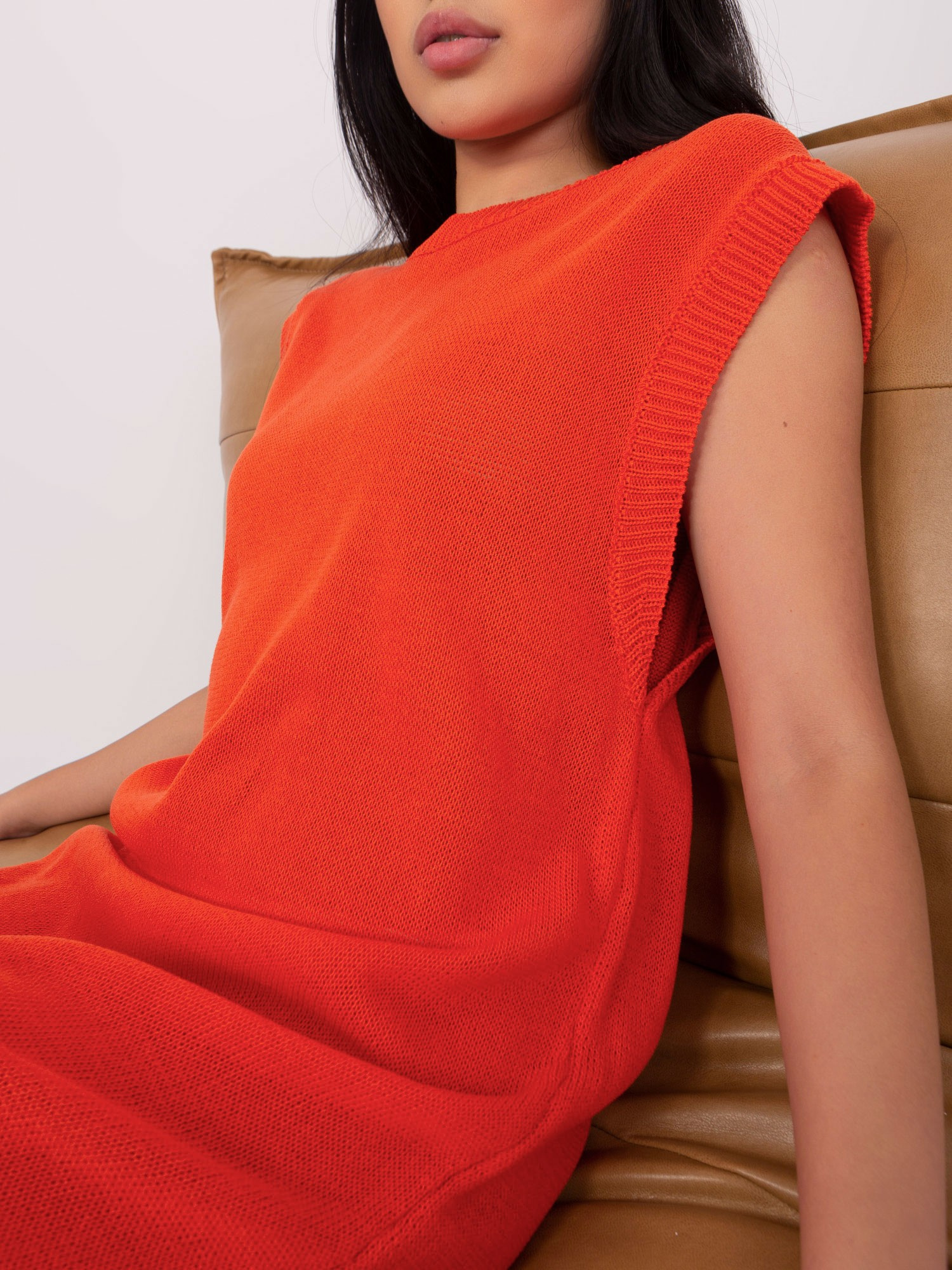 Pomarańczowa dzianinowa sukienka o kroju kamizelki .
