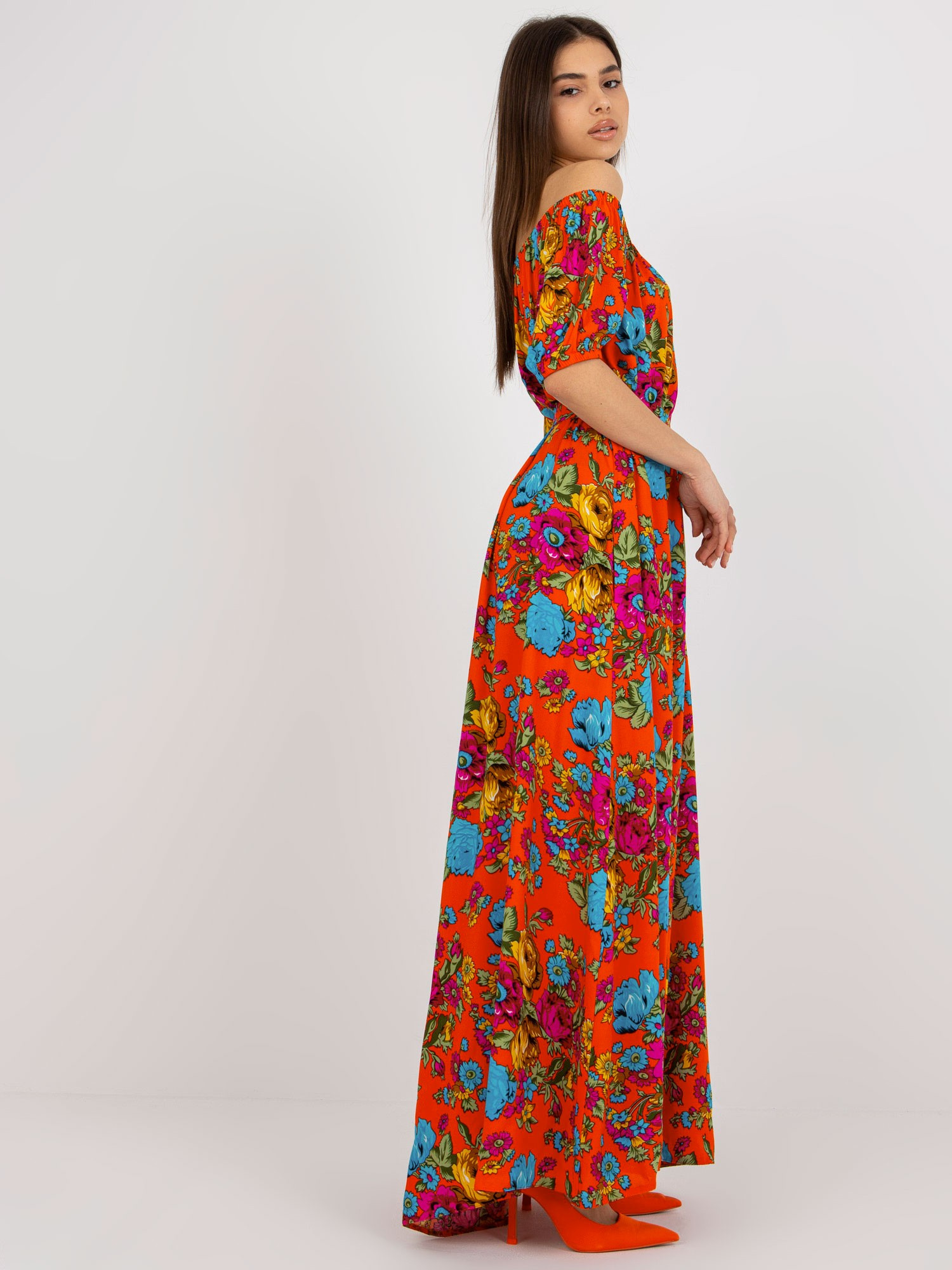 Pomarańczowa rozkloszowana sukienka hiszpanka w kwiaty .