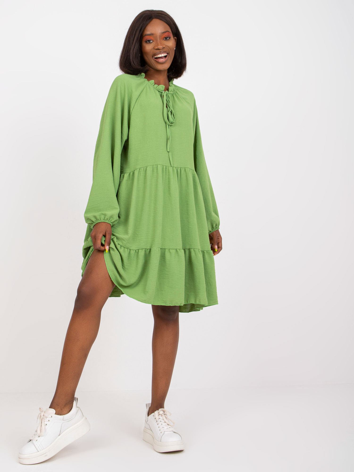 Wymiary sukienki w rozmiarze one size mierzone na płasko: szerokość pod pachami – 54 cm, długość całkowita – 86 cm, długość rękawa – 57 cm.