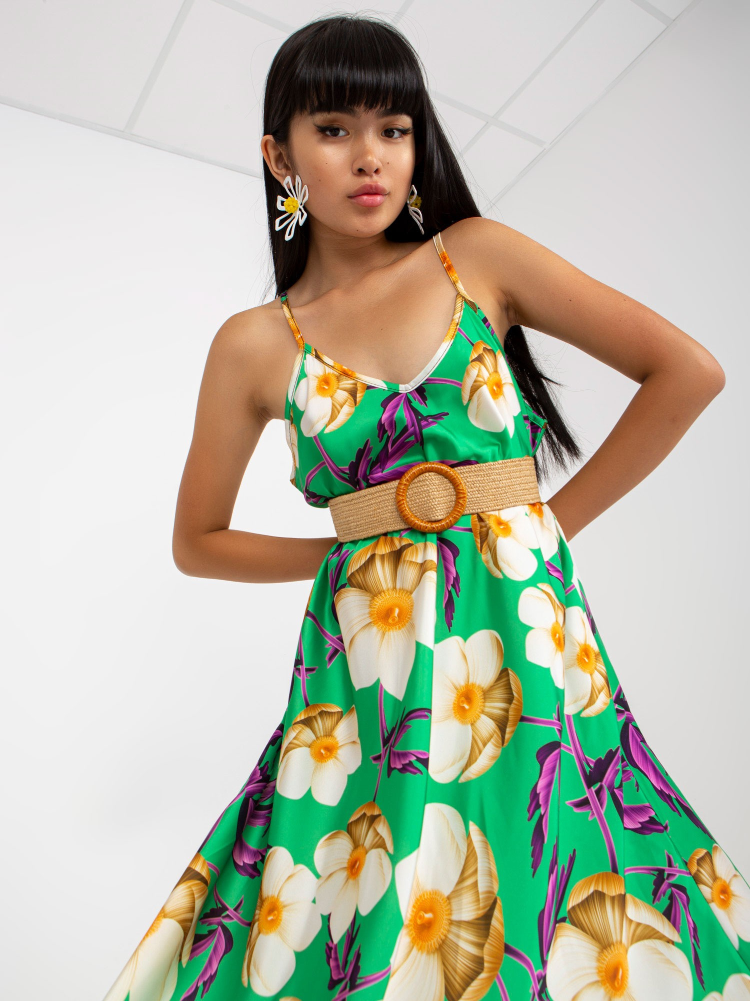Zielona maxi sukienka w kwiaty z plecionym paskiem .