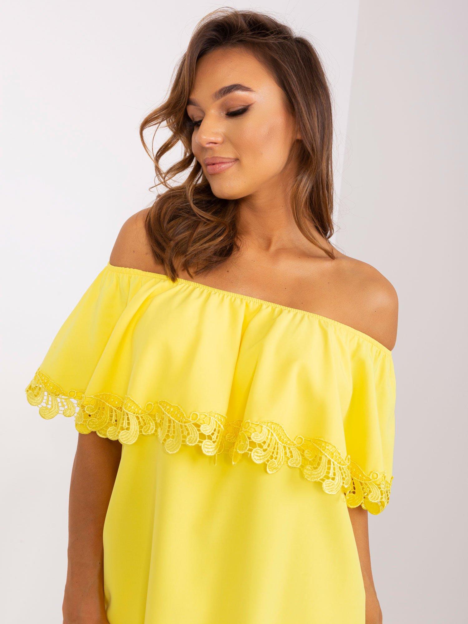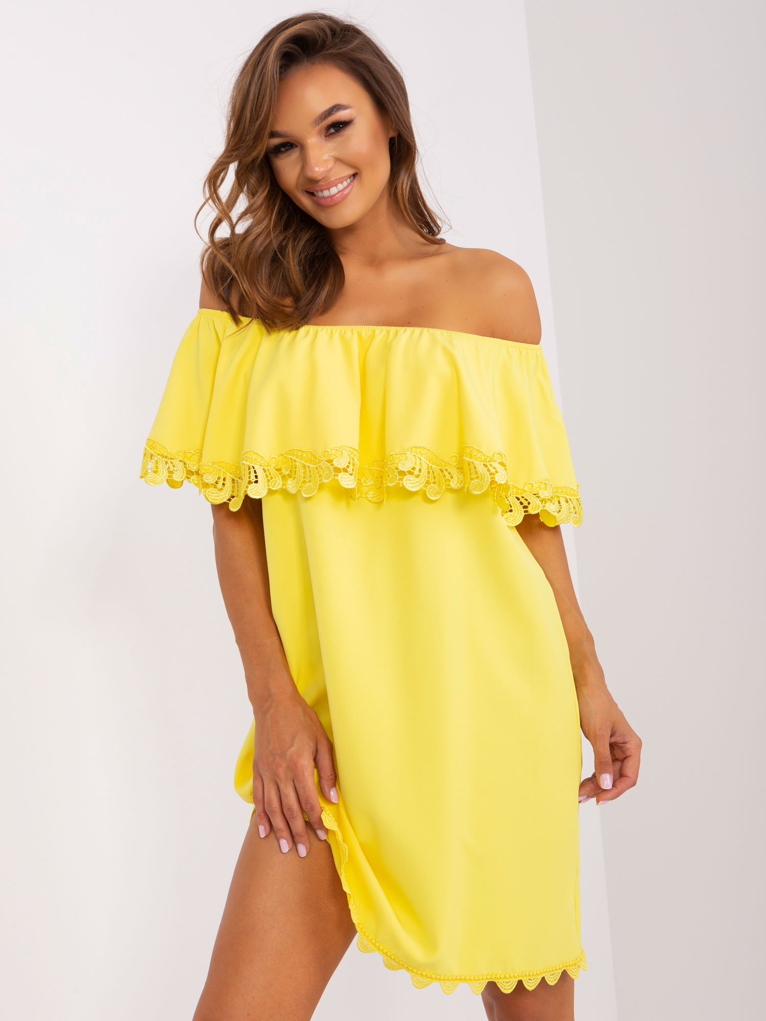 Żółta koktajlowa sukienka hiszpanka z falbaną .