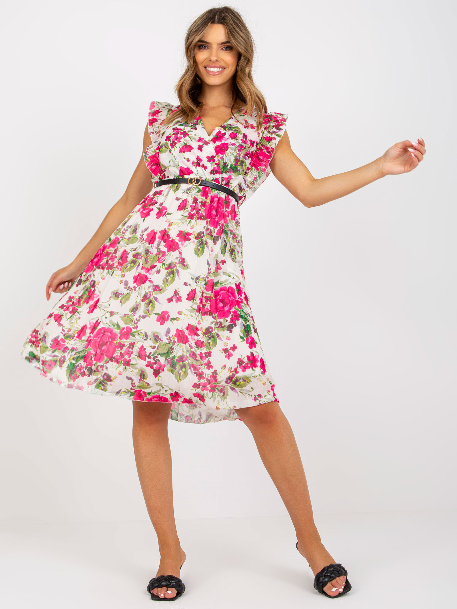 Modelka ma na sobie rozmiar S. Wymiary modelki: wzrost 173 cm, biust 90 cm, talia 64 cm, biodra 91 cm.