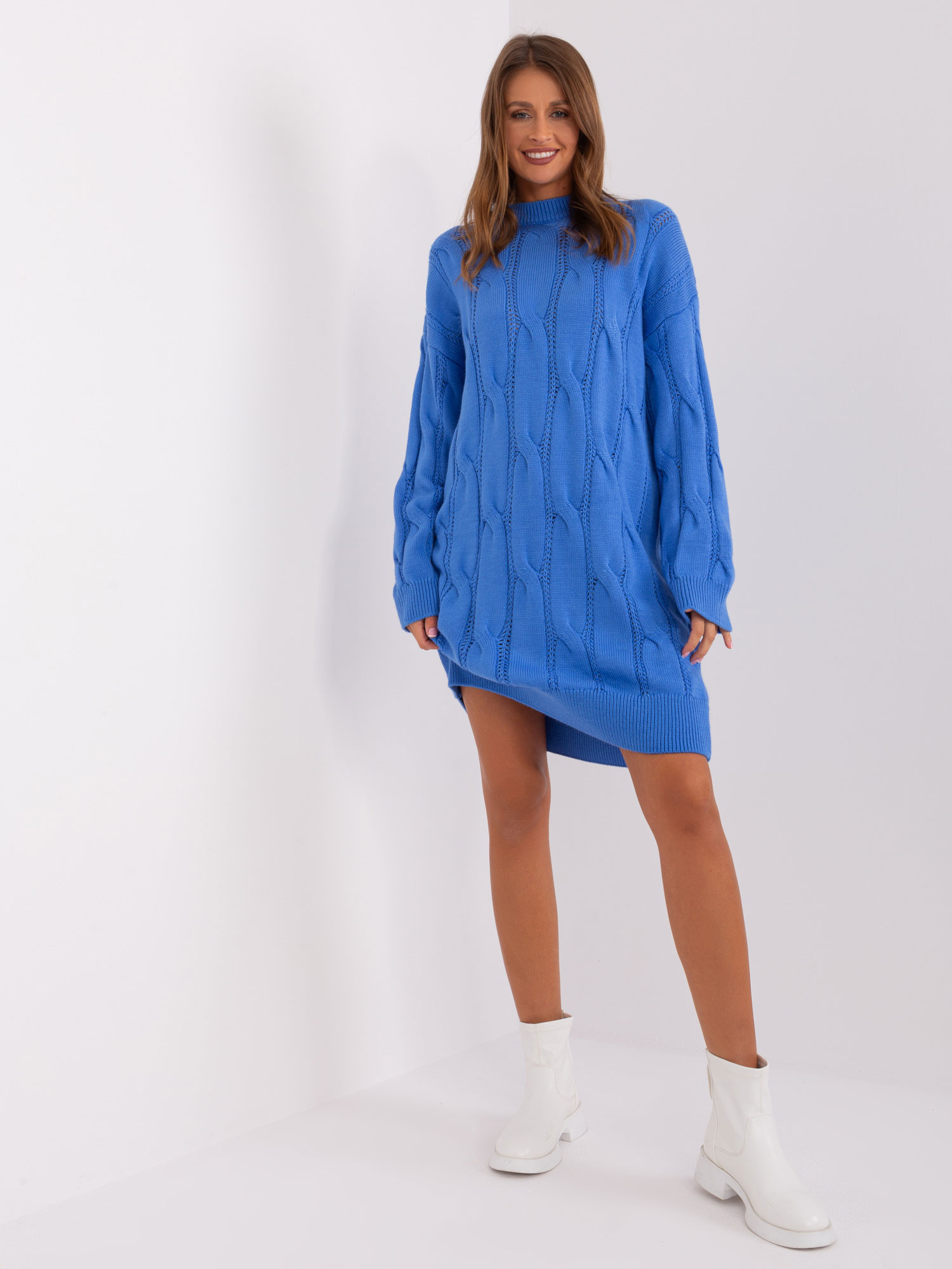 Wymiary swetra w rozmiarze one size mierzone na płasko: szerokość pod pachami – 52 cm, długość rękawa – 58 cm, długość całkowita – 61 cm.