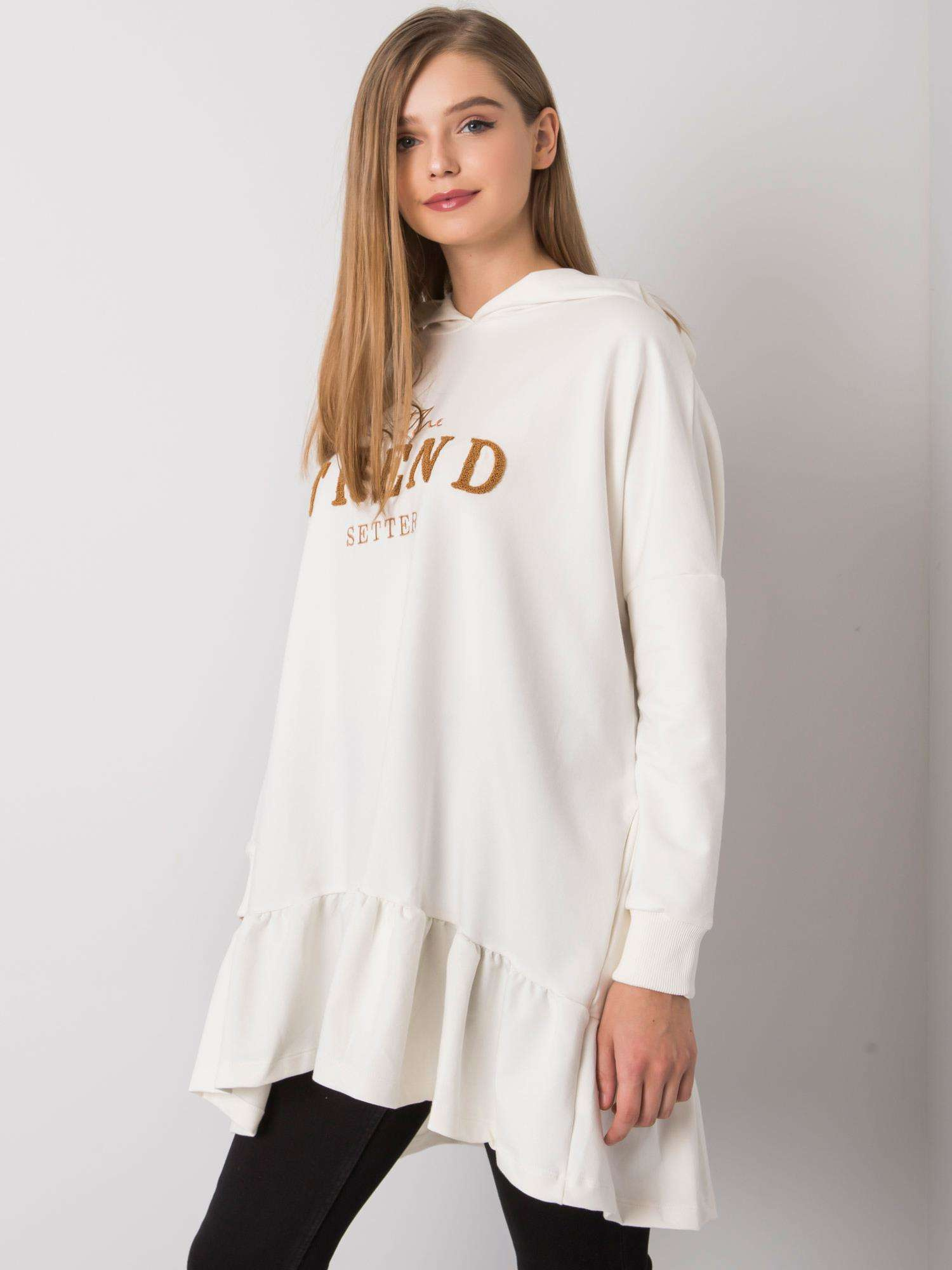 Wymiary swetra w rozmiarze one size mierzone na płasko: szerokość pod pachami – 48 cm, długość rękawa – 61 cm, długość całkowita – 63 cm.