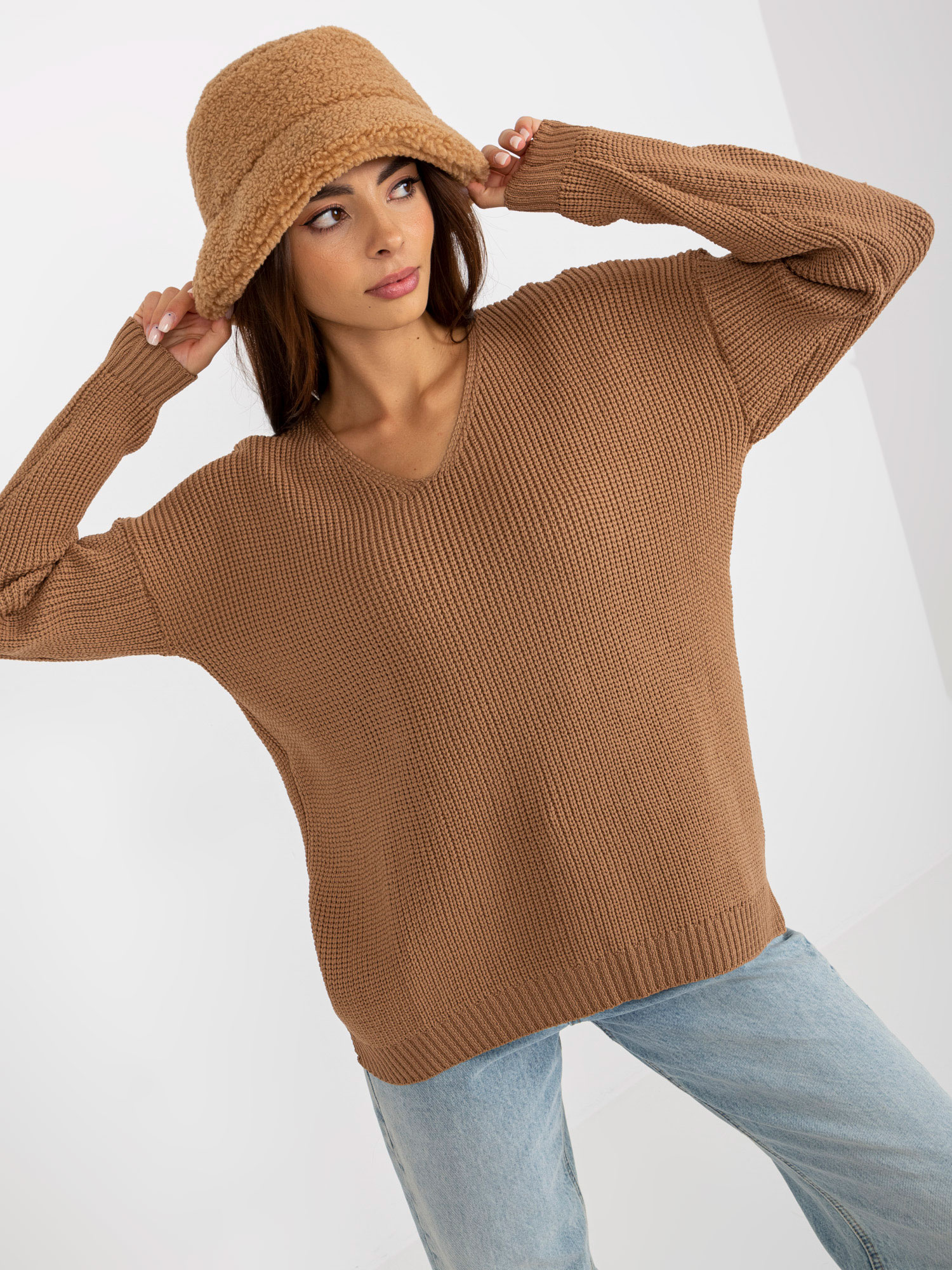 Camelowy damski sweter oversize z dzianiny .