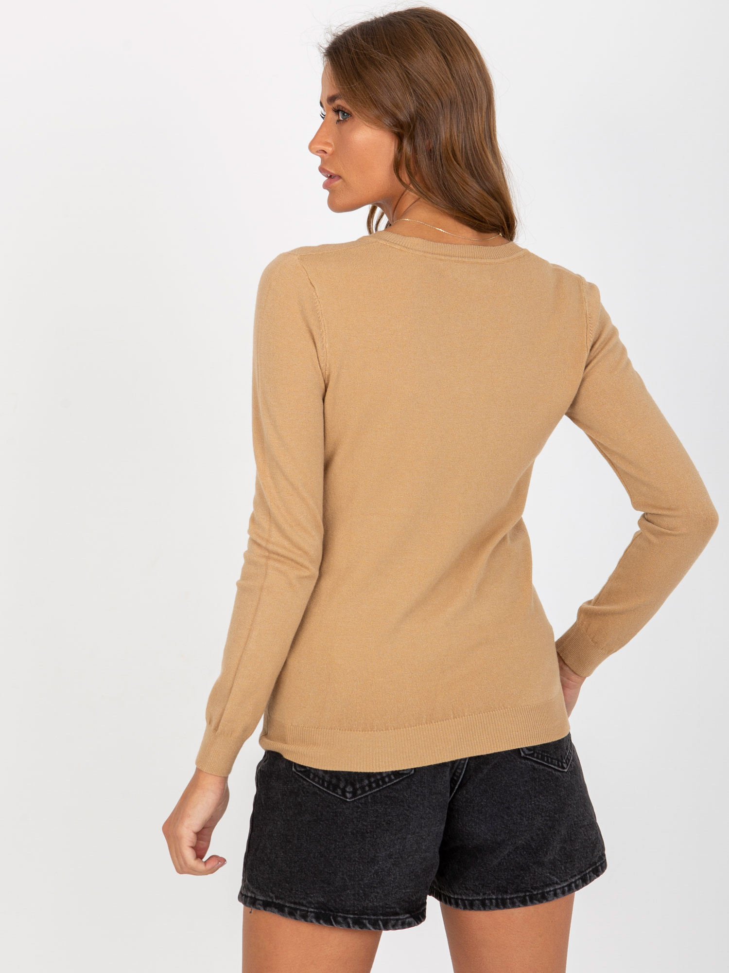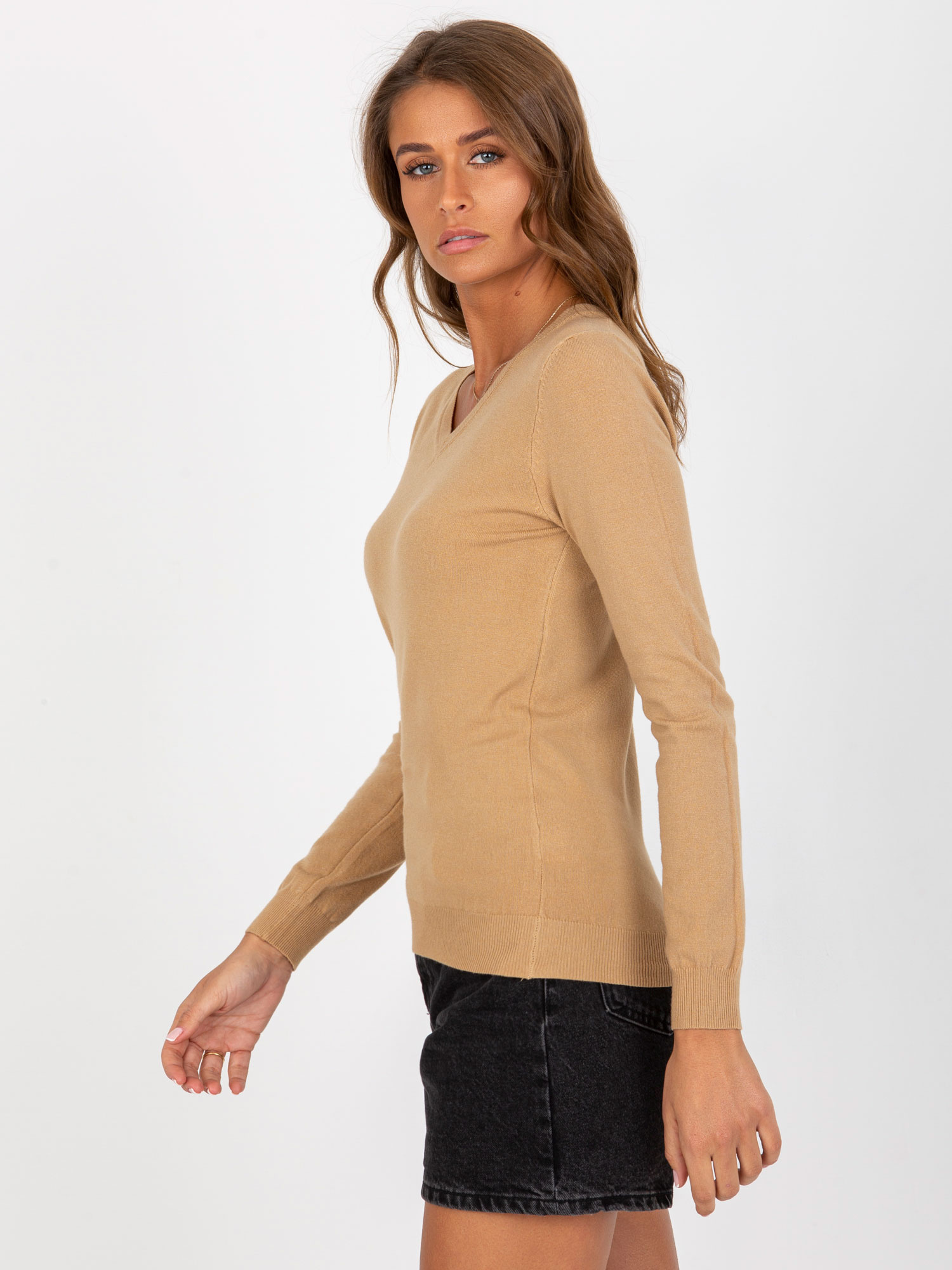 Camelowy gładki sweter klasyczny z dekoltem V .