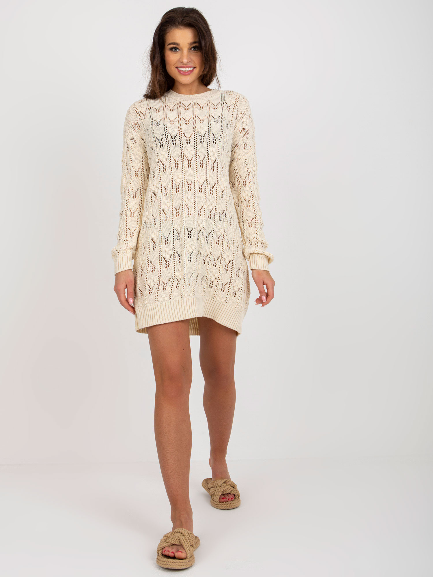 Wymiary swetra w rozmiarze one size mierzone na płasko: szerokość pod pachami – 48 cm, długość rękawa – 61 cm, długość całkowita – 63 cm.