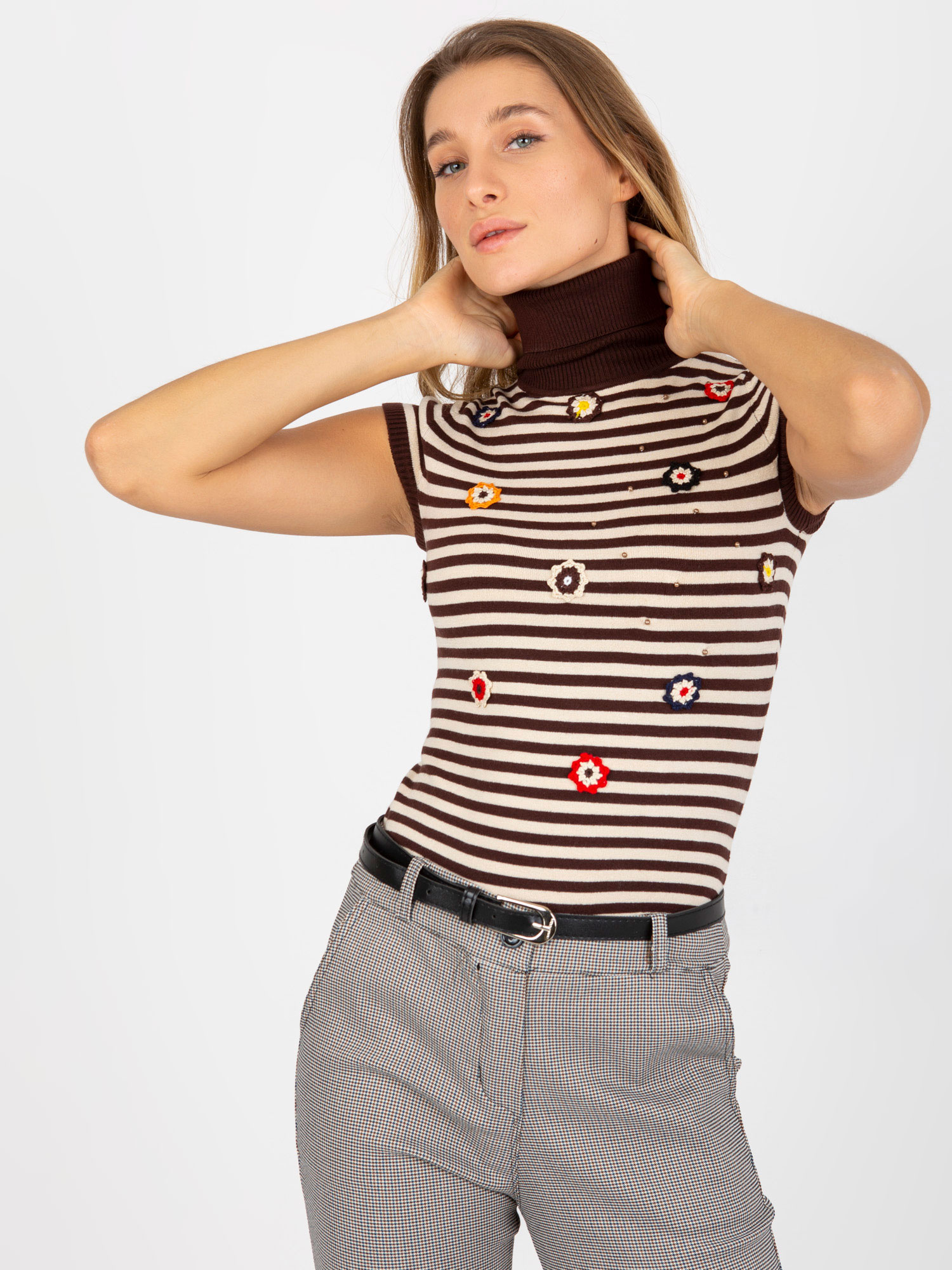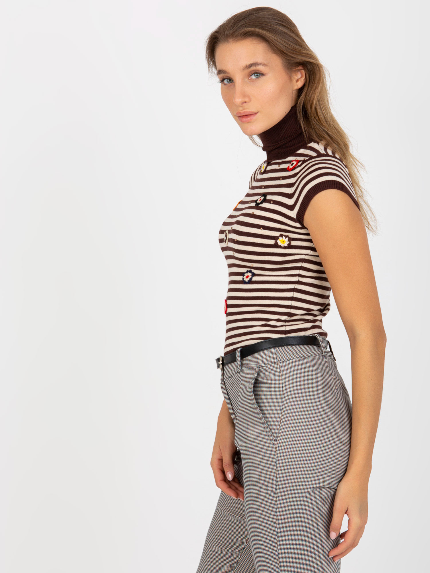 Ciemnobrązowy dopasowany sweter z golfem w paski .