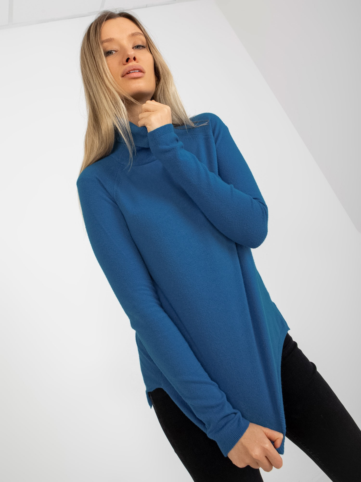 Ciemnoniebieski gładki sweter z golfem z wiskozą .