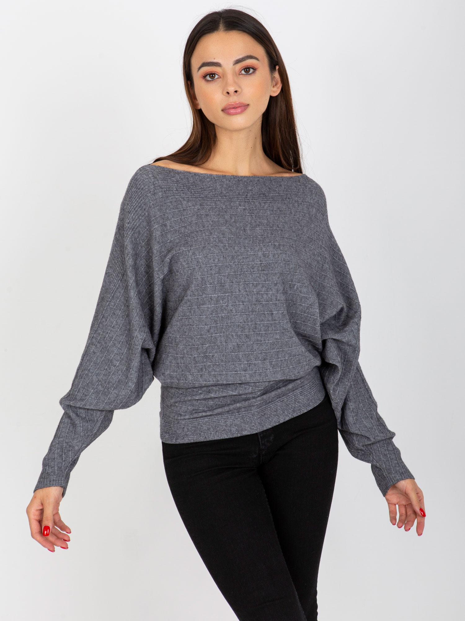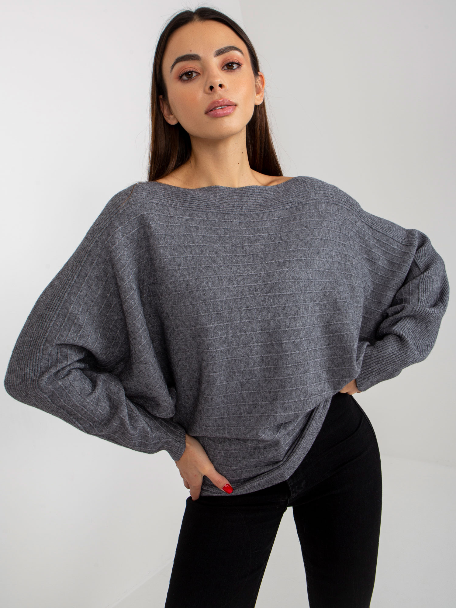 Ciemnoszary sweter oversize nietoperz na jedno ramię .