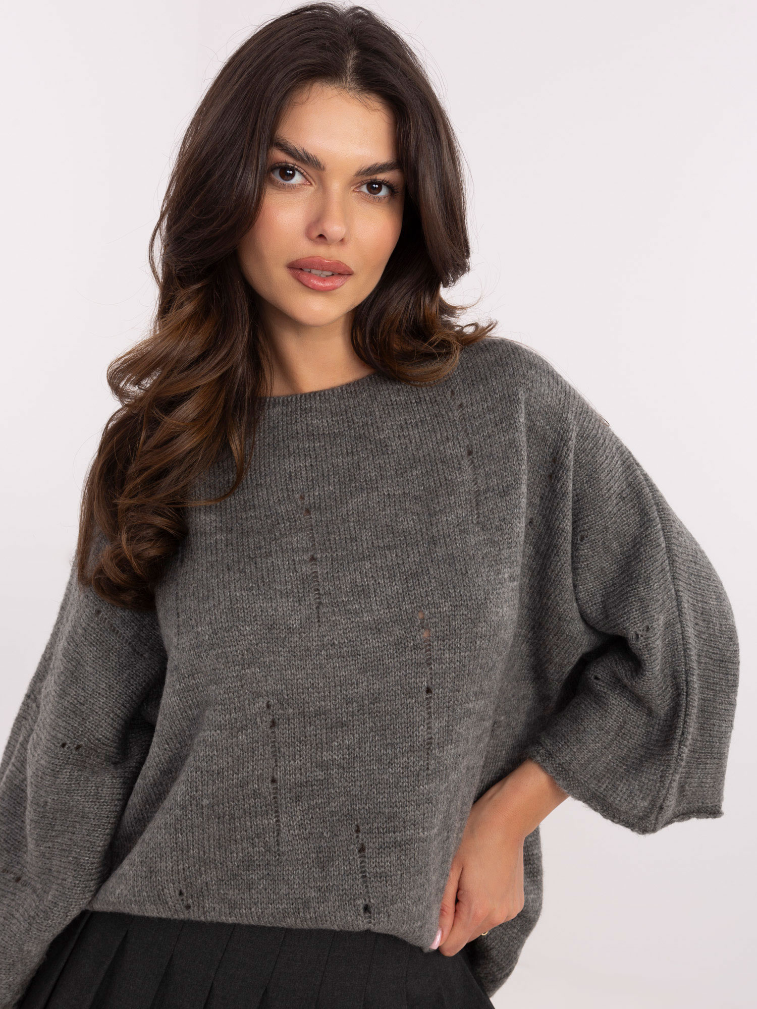 Wymiary swetra w rozmiarze one size mierzone na płasko: szerokość pod pachami – 54 cm, długość całkowita – 60 cm, długość rękawa – 56 cm.