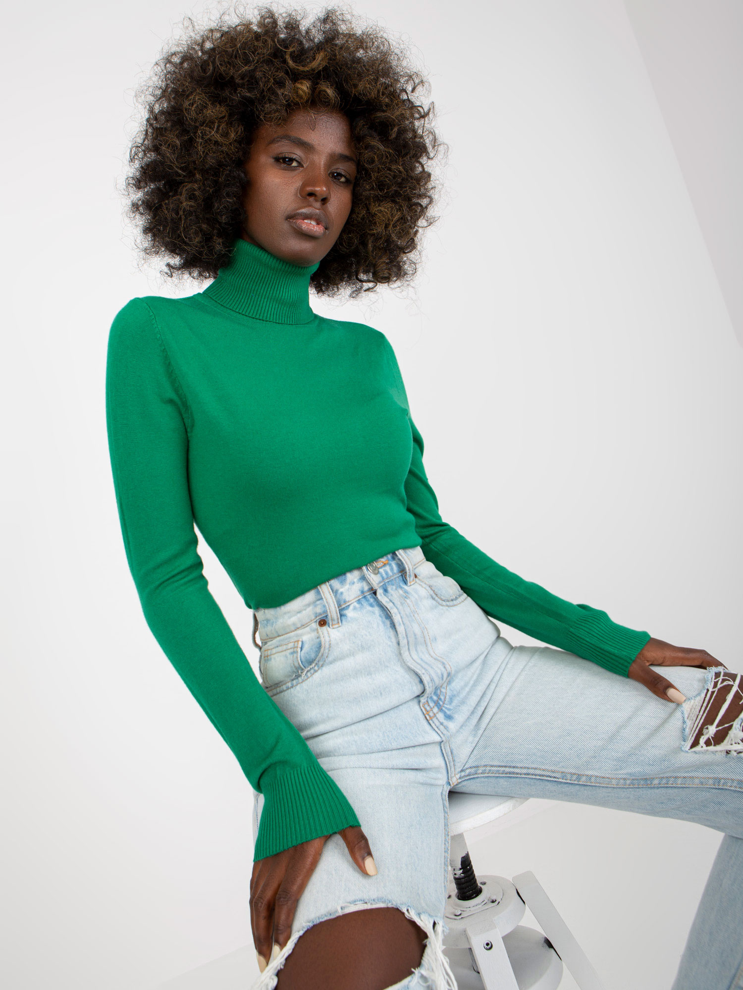Ciemnozielony damski sweter z golfem i długim rękawem .