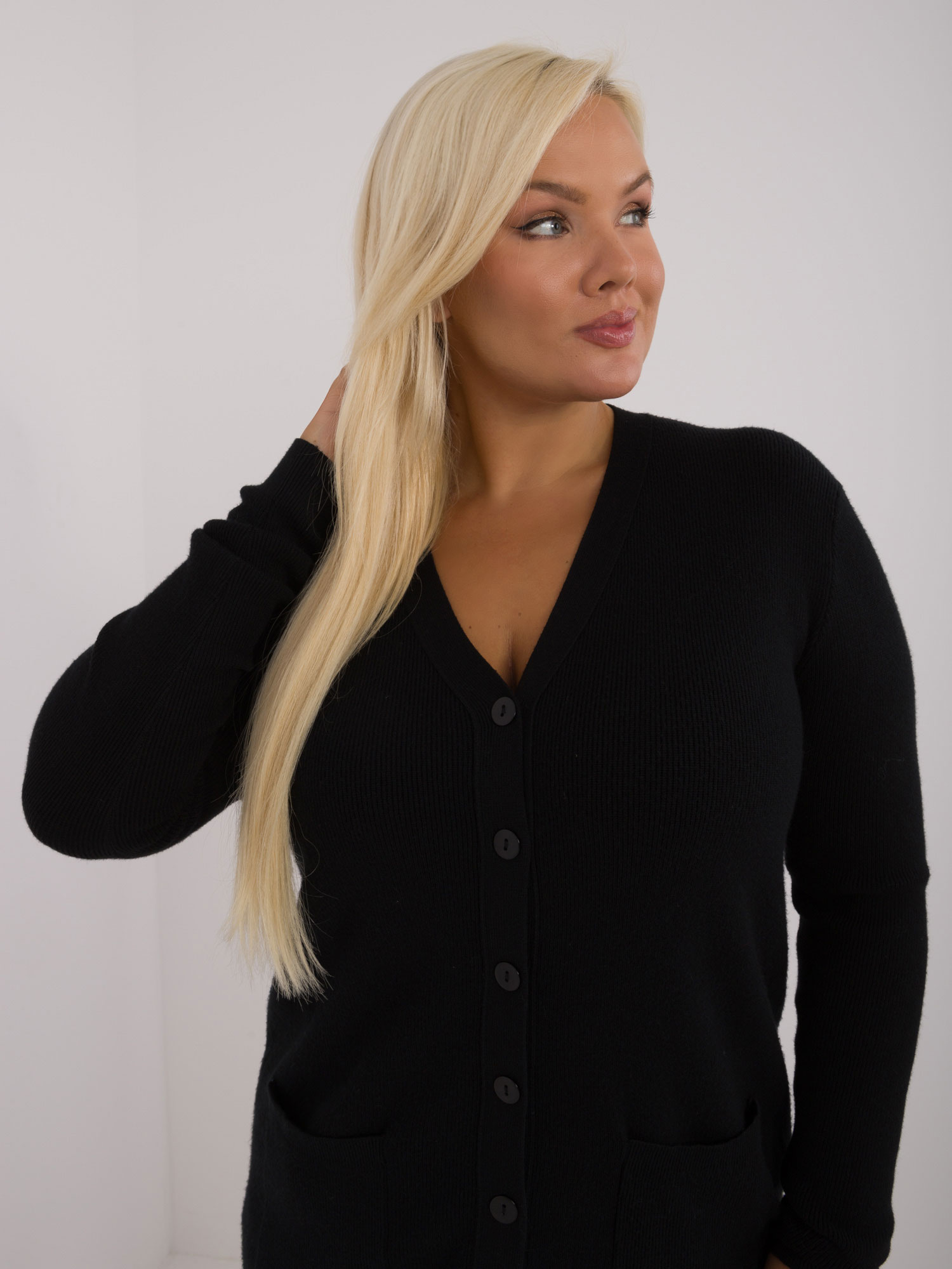 Modelka ma na sobie rozmiar XL/XXL. Wymiary modelki: wzrost 172 cm, biust 103 cm, talia 73 cm, biodra 103 cm.