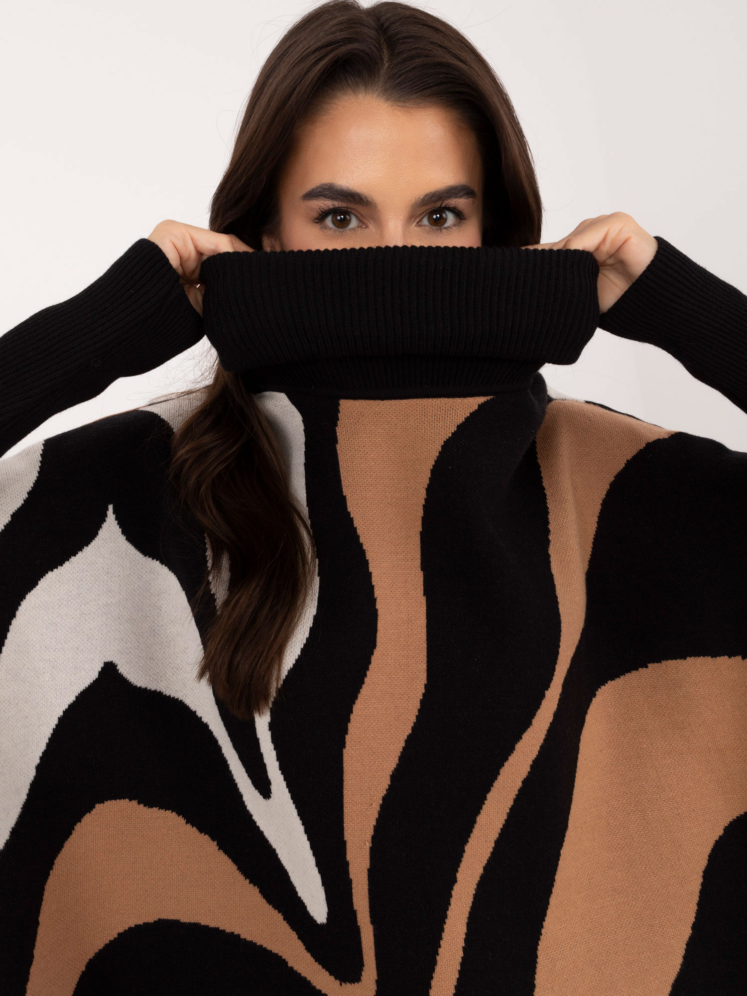 Wymiary swetra w rozmiarze one size mierzone na płasko: szerokość pod pachami – 80 cm, długość rękawa – 57 cm, długość całkowita – 76 cm.