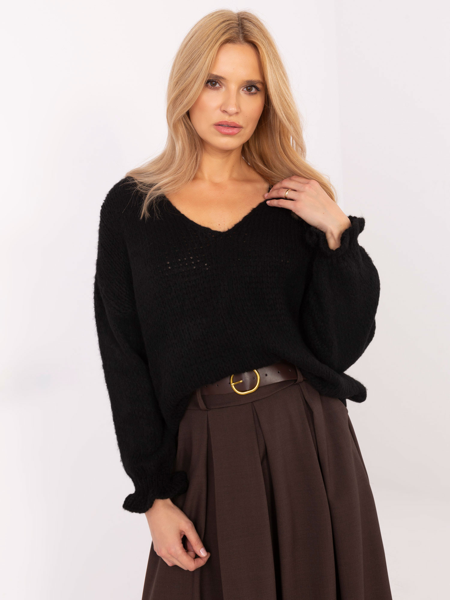 Wymiary swetra w rozmiarze one size mierzone na płasko: szerokość pod pachami – 78 cm, szerokość w biodrach – 56 cm, długość rękawa – 42 cm (od szwu), długość całkowita – 56 cm.