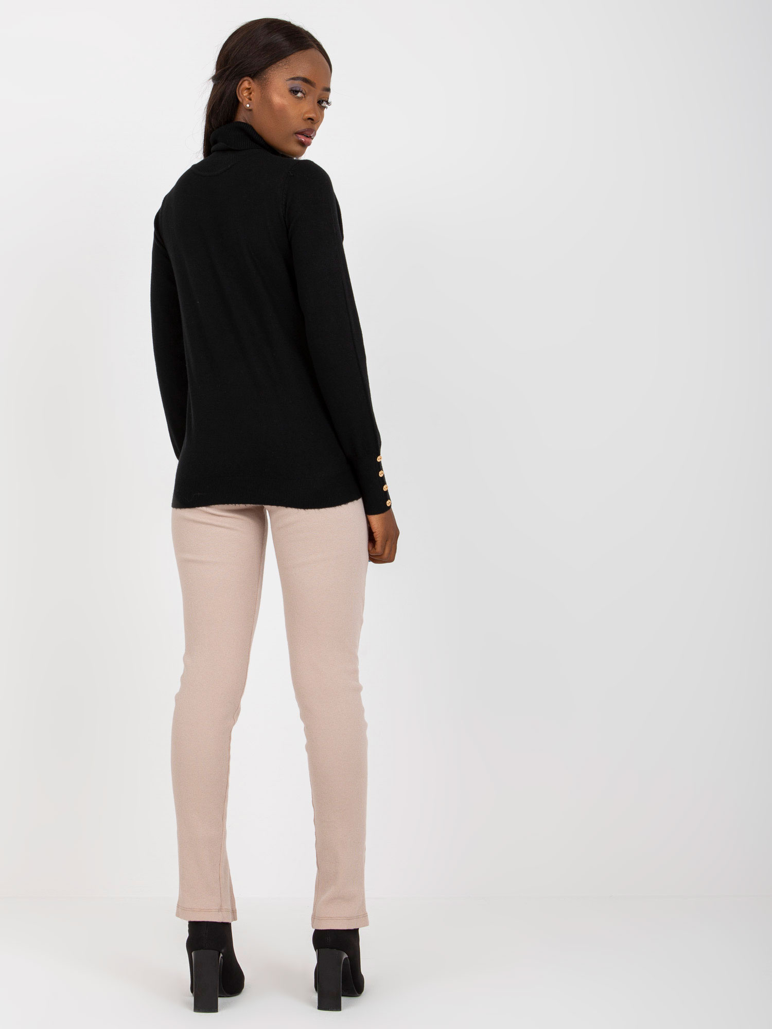 Czarny damski sweter z golfem i aplikacją przy rękawach .