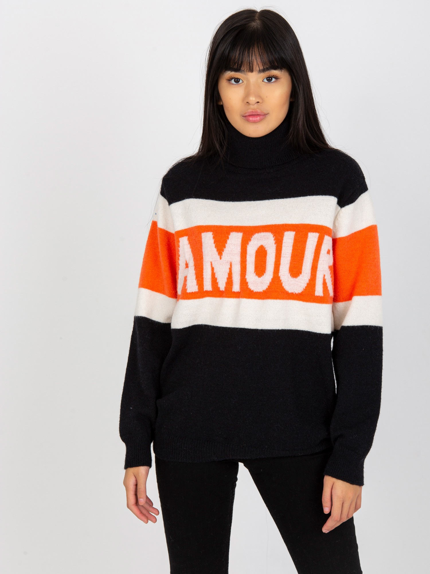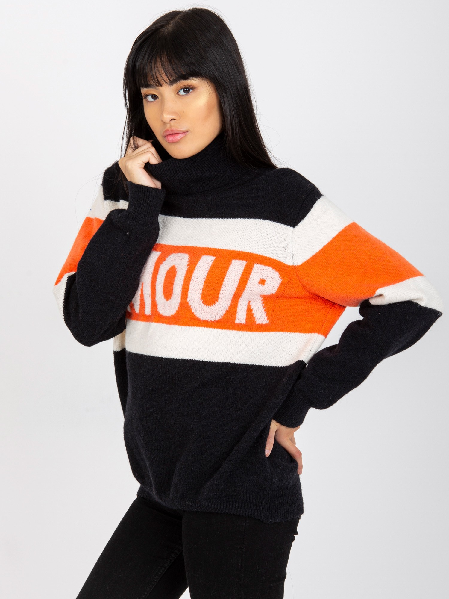 Czarno-pomarańczowy luźny sweter z golfem i napisem .