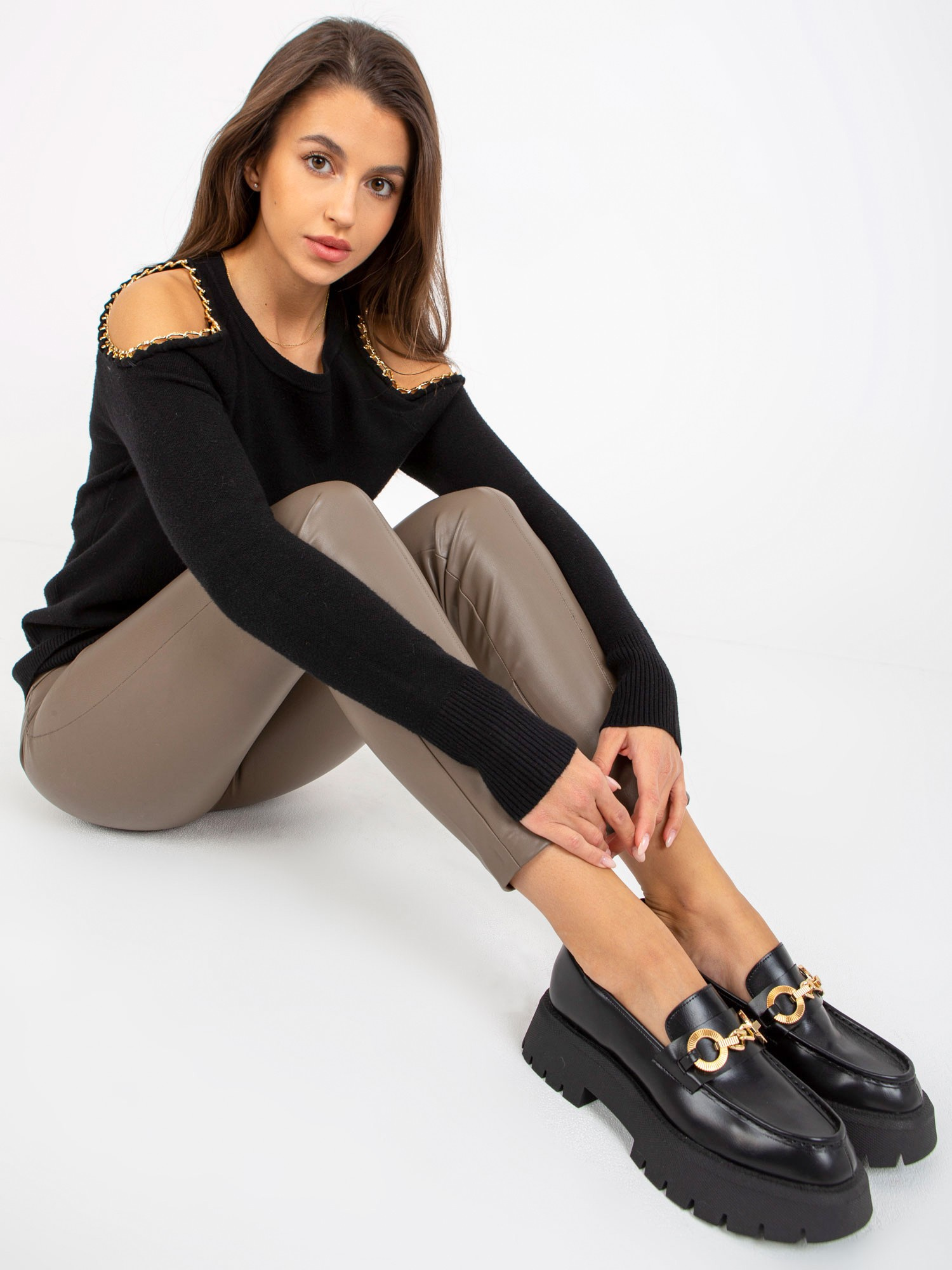 Czarny sweter z odkrytymi ramionami i okrągłym dekoltem .