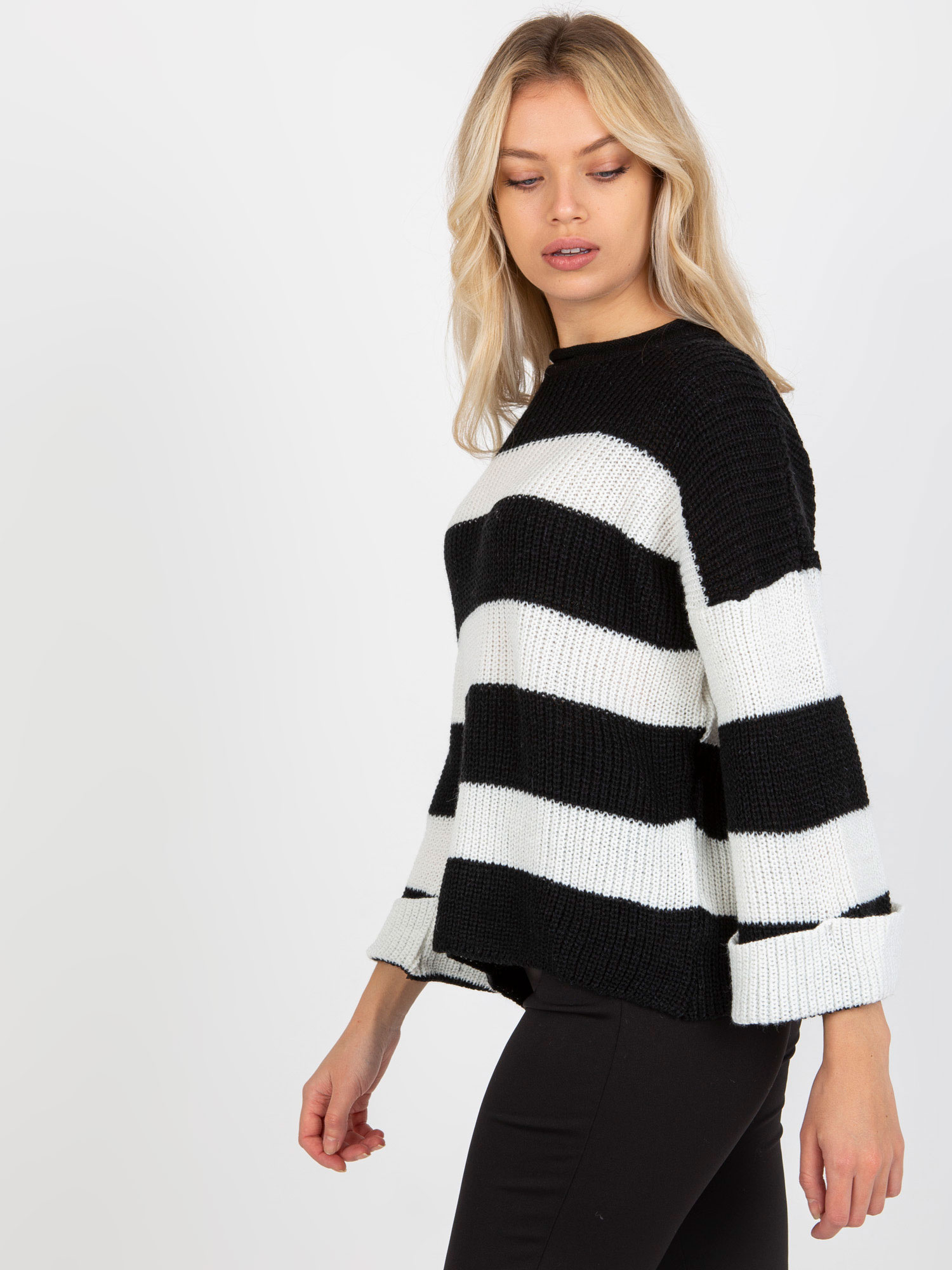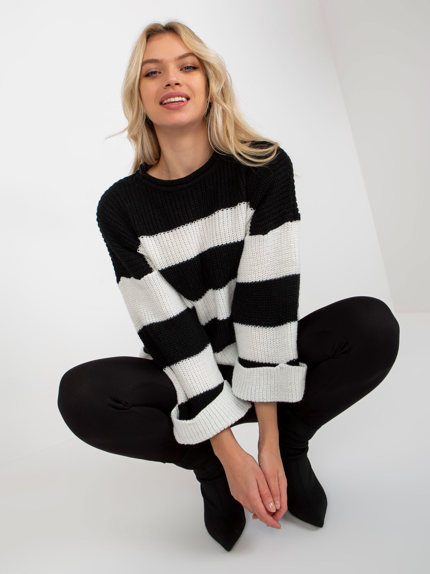 Wymiary swetra w rozmiarze one size mierzone na płasko: szerokość pod pachami – 67 cm, długość rękawa – 59 cm, długość całkowita – 62 cm.