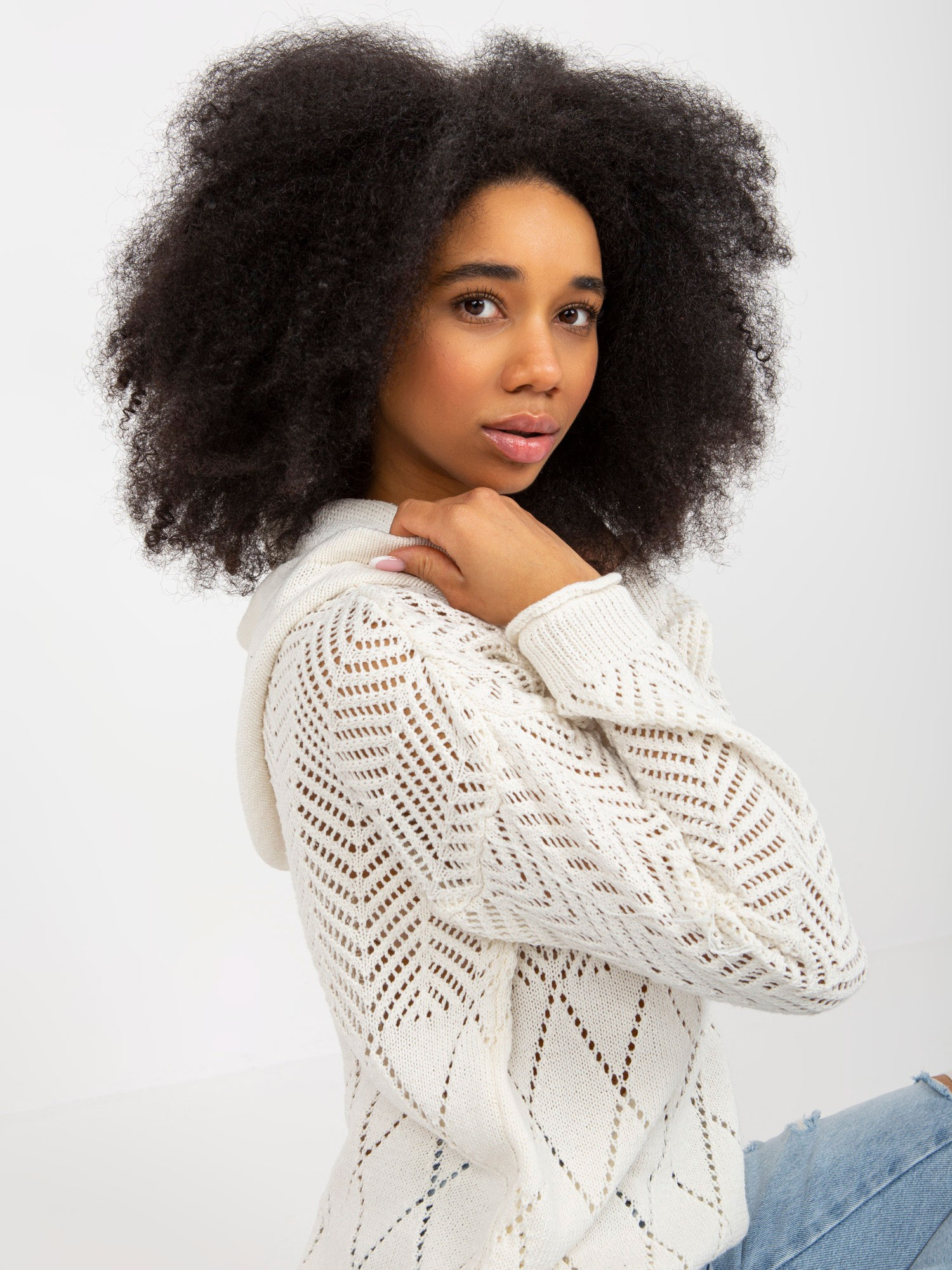 Ecru ażurowy sweter letni z kapturem .