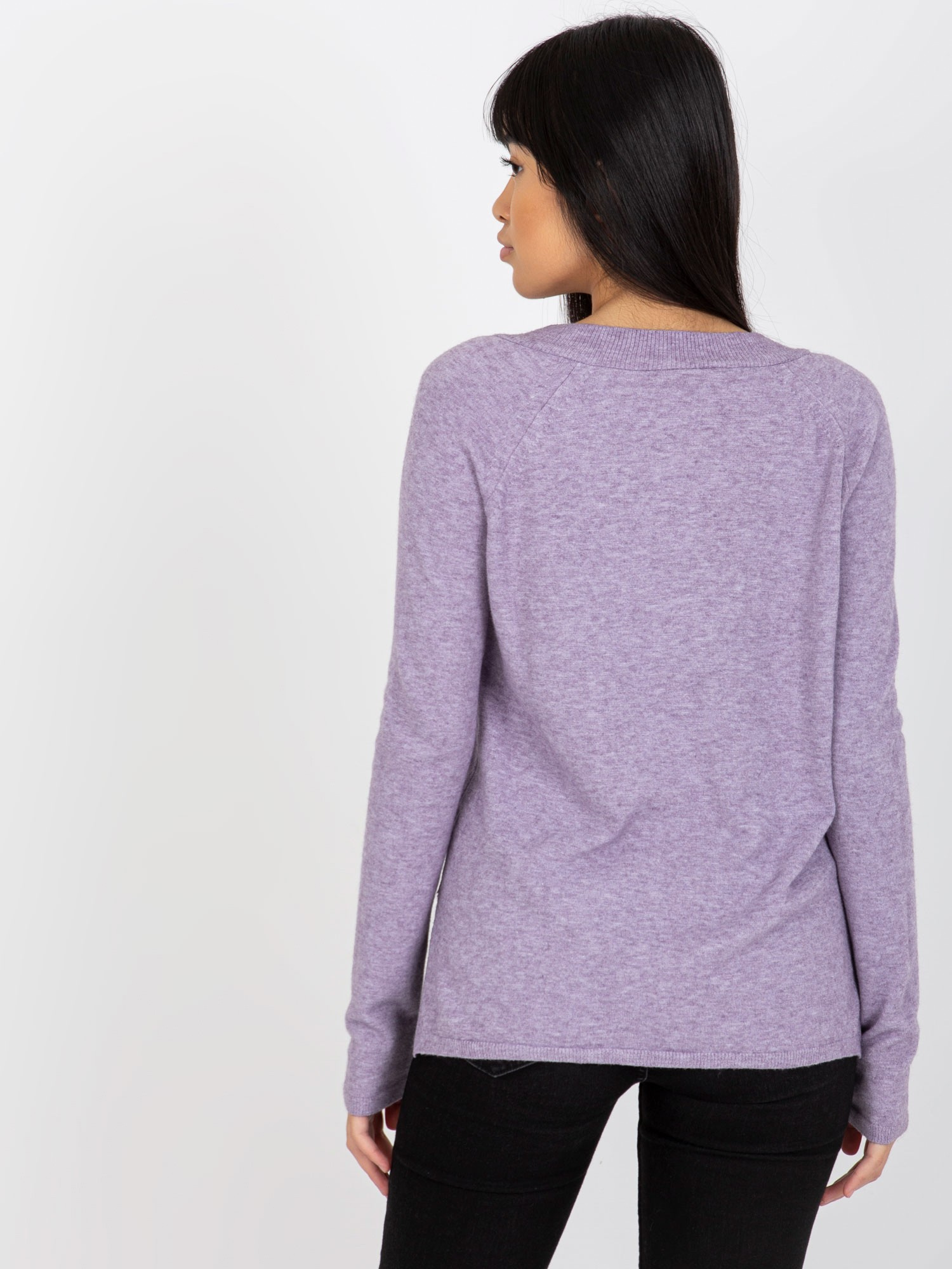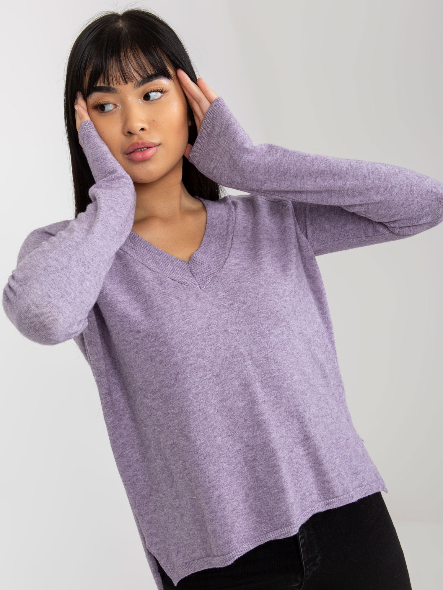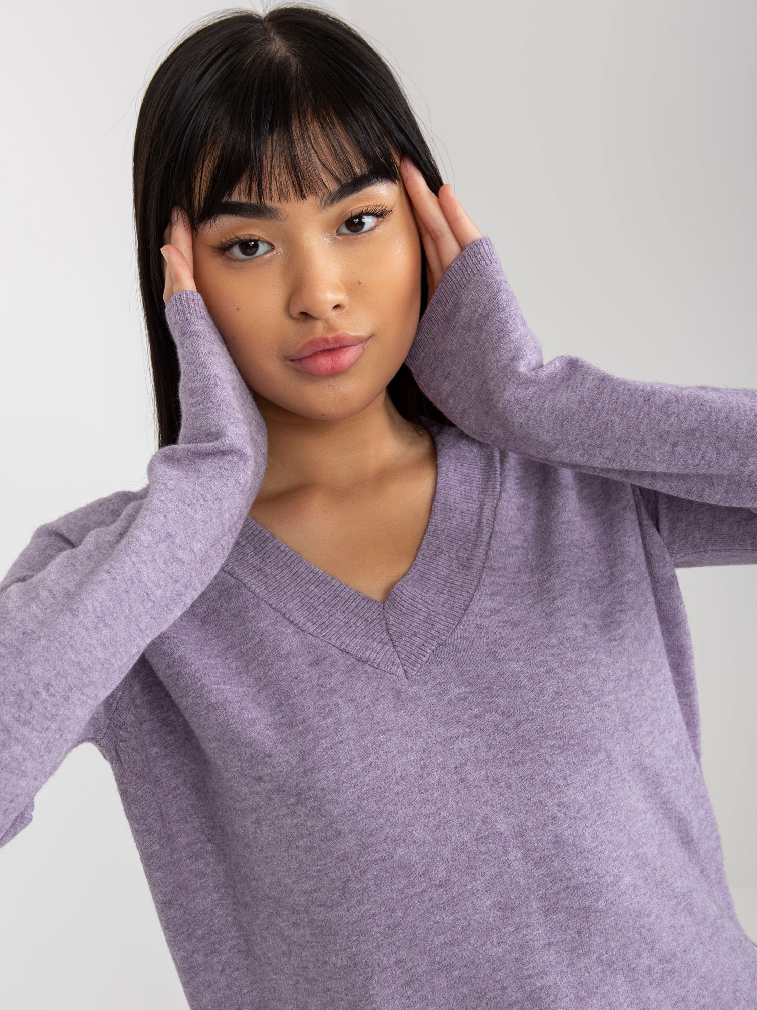 Fioletowy gładki sweter klasyczny z dekoltem V .