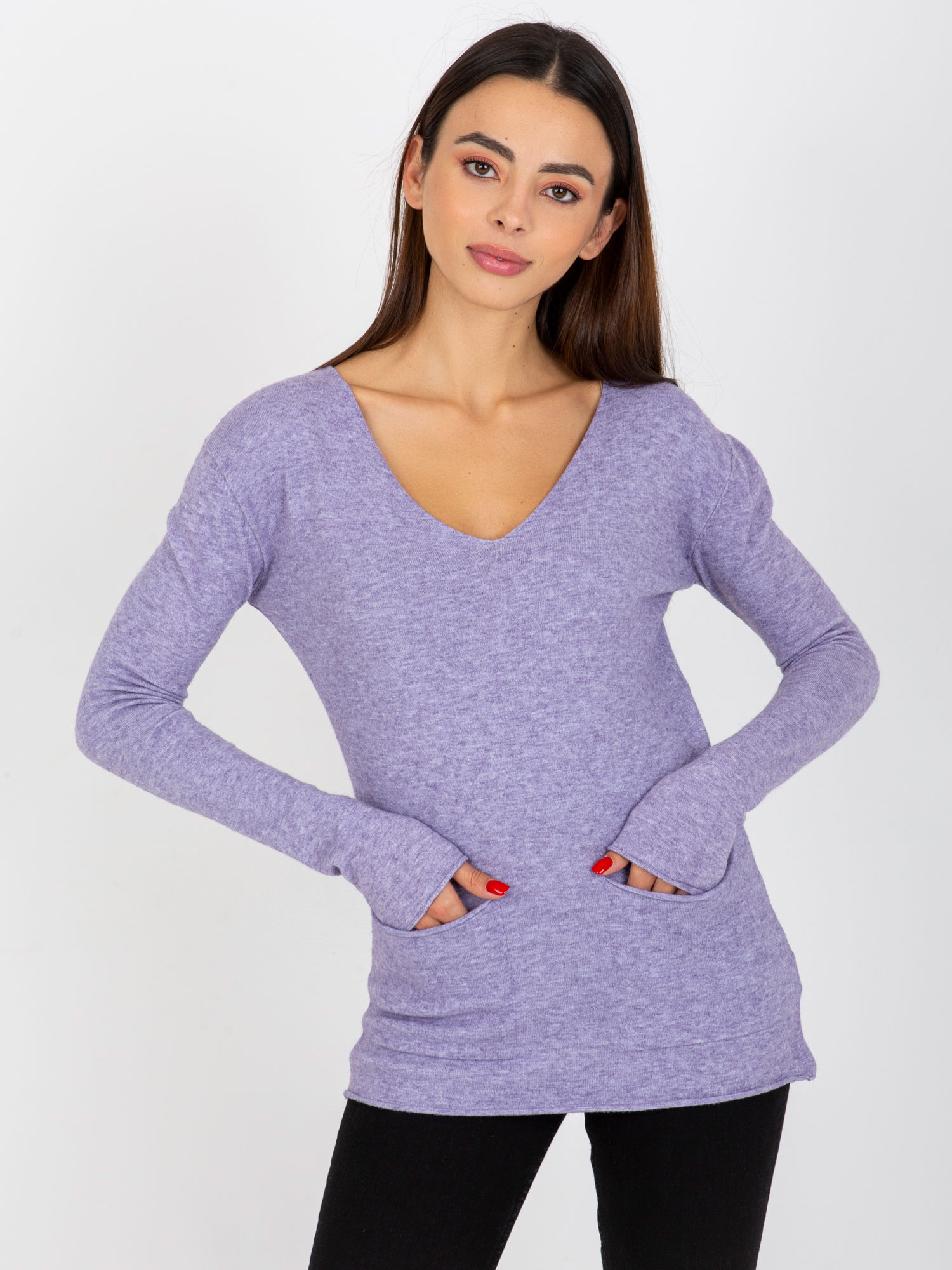 Fioletowy damski sweter klasyczny z kieszeniami .