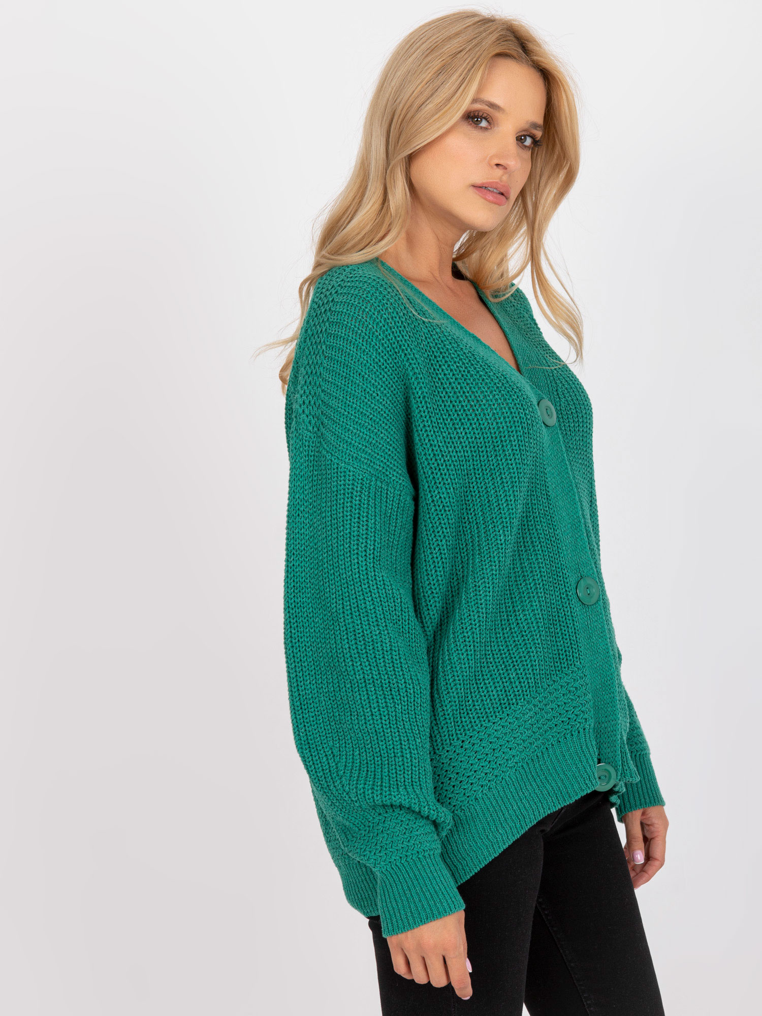 Wymiary swetra w rozmiarze one size mierzone na płasko: szerokość pod pachami – 65 cm, długość całkowita – 65 cm, długość rękawa – 63 cm.